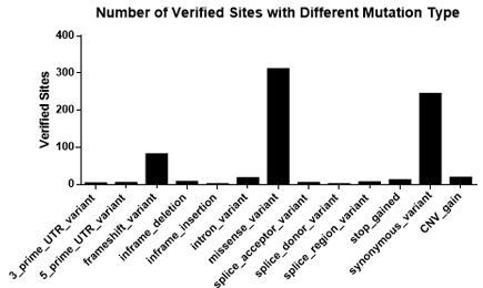 圖3. 不同突變頻率的位點(diǎn)數(shù)(經(jīng)過(guò)驗(yàn)證的位點(diǎn)) 6. 突變類(lèi)型全覆蓋,有UTR區(qū)域,有內(nèi)含子,有外顯子,有錯(cuò)義突變,有同義突變,有供體變異等等;