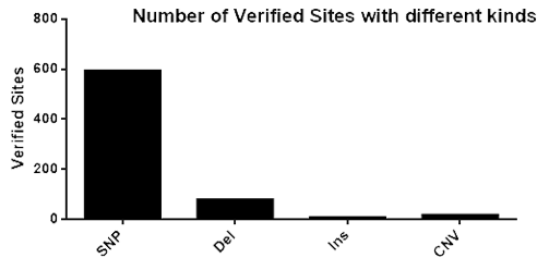 圖1. 在不同染色體編號(hào)上的位點(diǎn)數(shù)(經(jīng)過(guò)驗(yàn)證的位點(diǎn)) 4. 變異種類(lèi)多:涉及SNP,deletion,insertion,CNV等等;