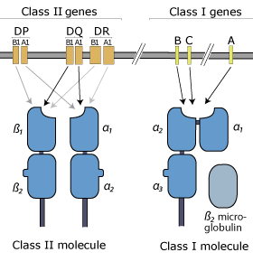 II類區(qū)域?qū)?yīng) HLA-DR、-DQ和 -DP基因等,編碼 α 鏈基因 (A1) 和 β 鏈基因 (B1)。α鏈和 β鏈配對形成功能性HLA分子。大多數(shù)個體攜帶額外的DRB基因 (DRB3 或 DRB4 或 DRB5),該基因編碼可能與α鏈配對的不同β鏈。