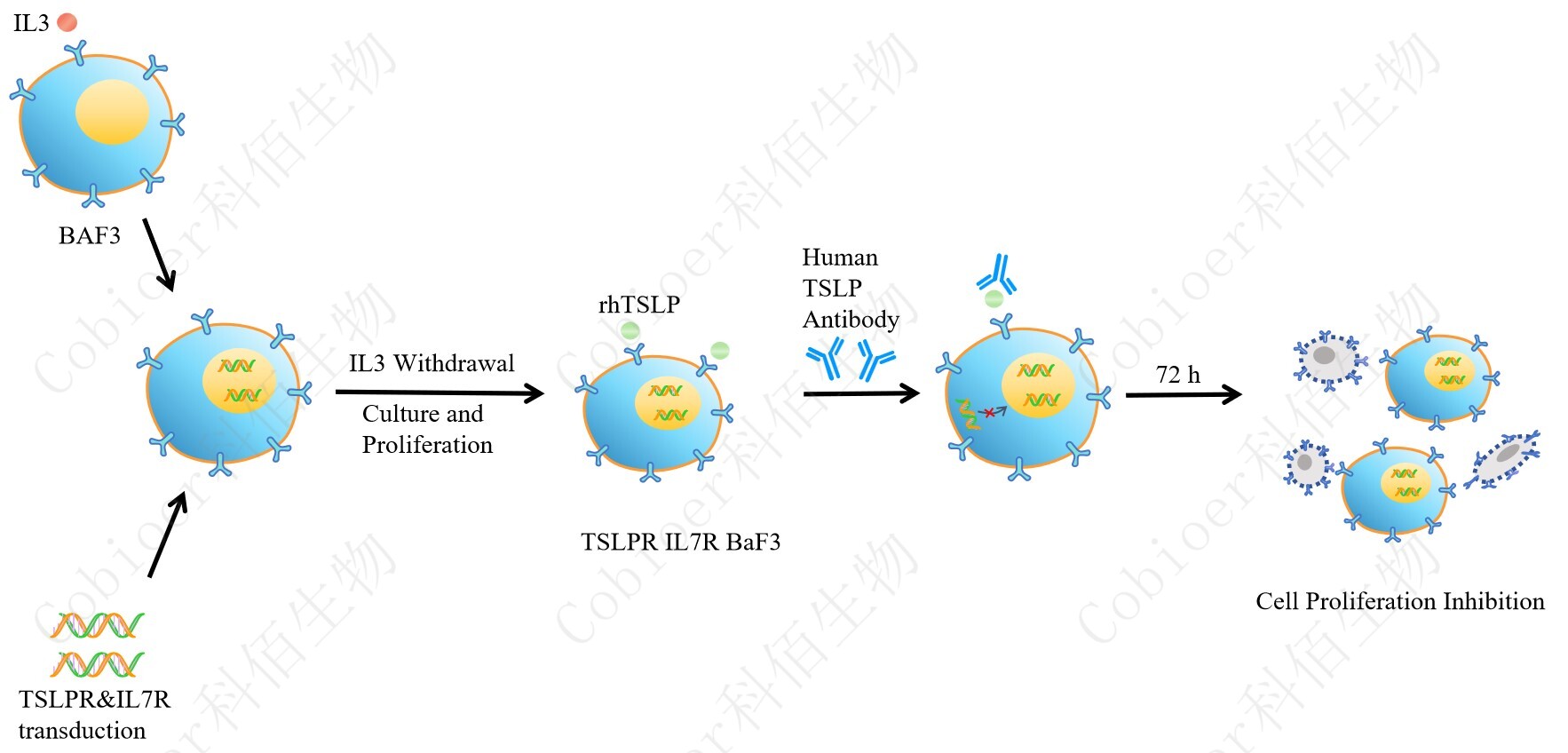 BaF3(小鼠原 B 細胞)的生長和增殖需要 IL-3 的維持。通過引入各種表達激酶的基因, 能作為 BaF3 的驅(qū)動基因,讓 BaF3 不再依賴 IL-3 而增殖,進而激酶基因成為 BaF3 增殖依賴的驅(qū)動基因,用于評估小分子藥物對激酶的靶向抑制作用,原理及流程見下圖所示。![]() Figure 1. TSLPR IL7R BaF3 細胞模型原理圖 |