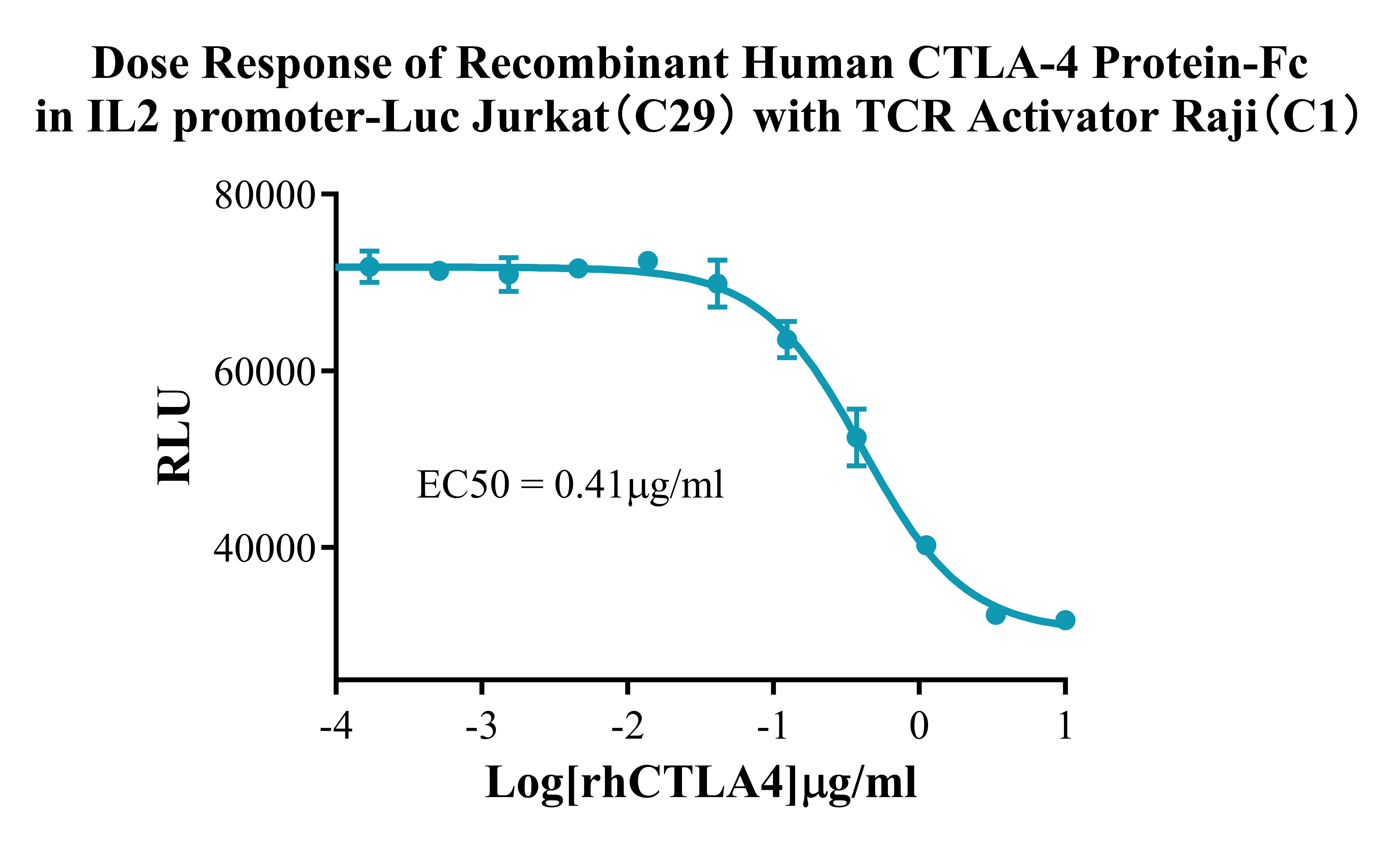 Figure 4. Dose Response of Recombinant Human CTLA-4 Protein-Fc in IL2 Promoter-Luc Jurkat (C29)with TCR Activitor Raji (C1).