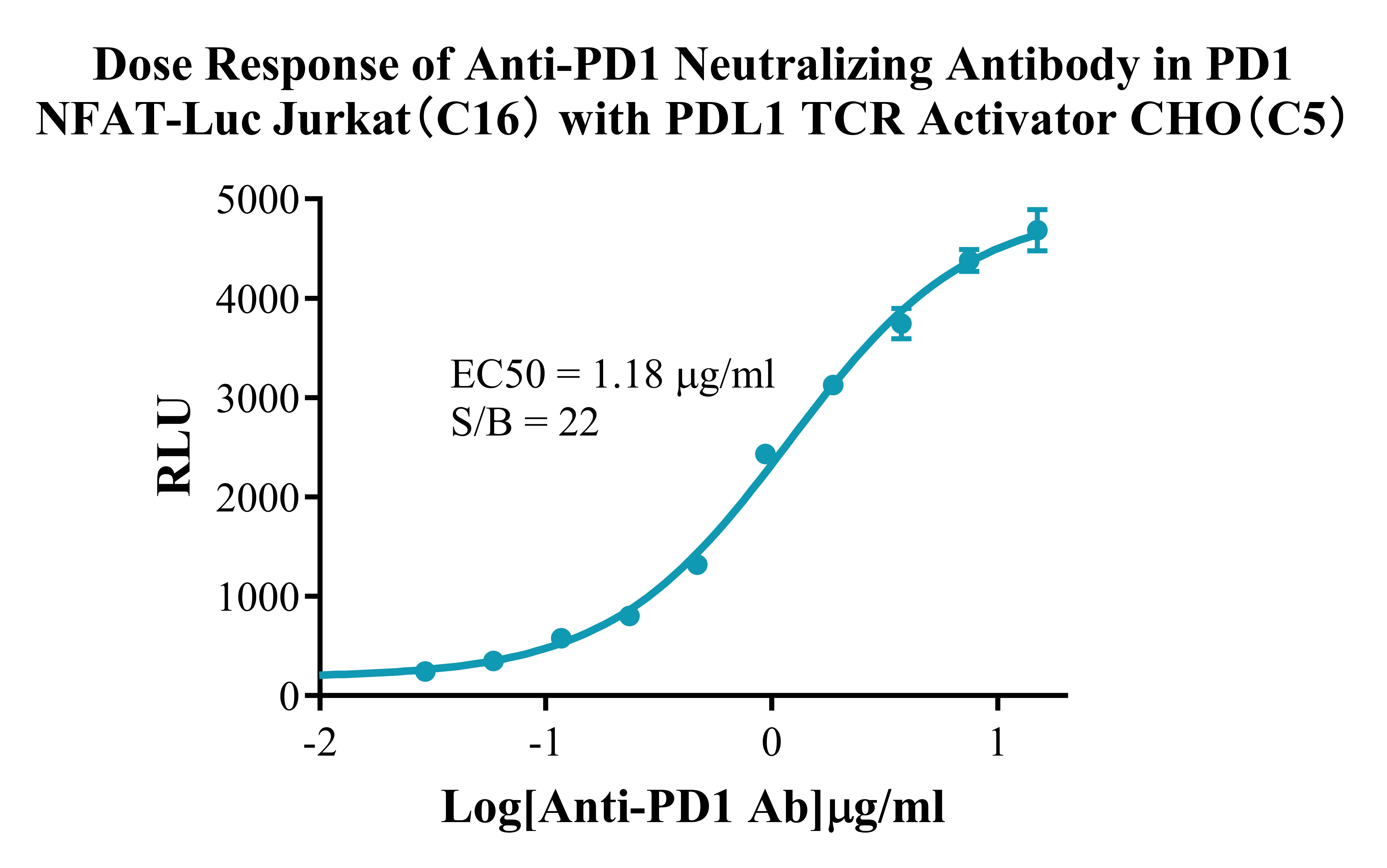 Figure 3. Detect Luciferase assay by Ultra Luciferase Detection Kit CBPH0001(we strongly suggest to purchase from Cobioer).Dose response of Anti-PD-1 Neutralizing Antibody in PD1 NFAT-Luc Jurkat(C16) with PDL1 TCR Activator CHO (C5). |