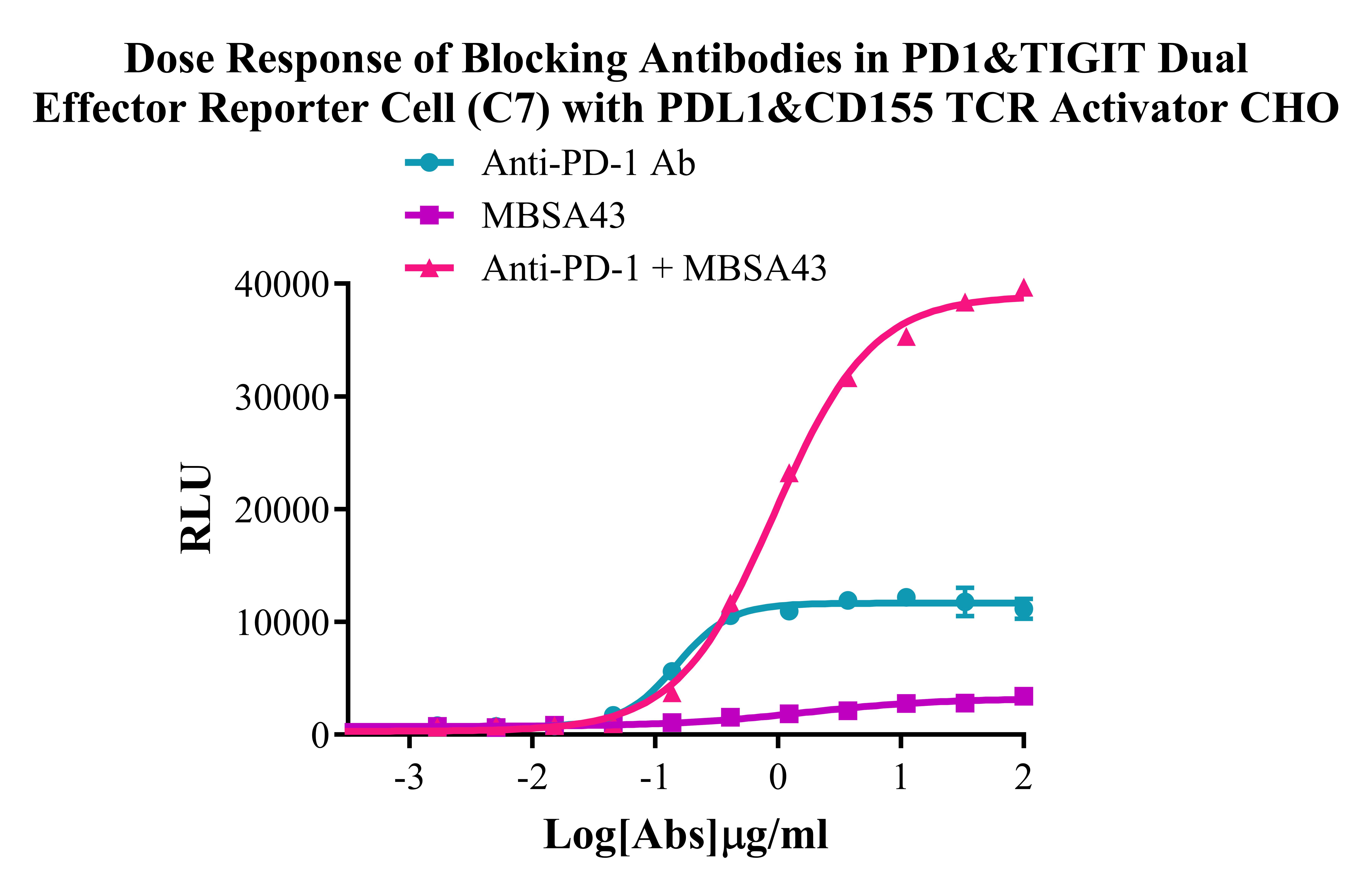 Figure 3. Dose Response of Blocking Antibodies in PD1&TIGIT Dual Effector Reporter Cell (C7) with PDL1&CD155 TCR Activator CHO.