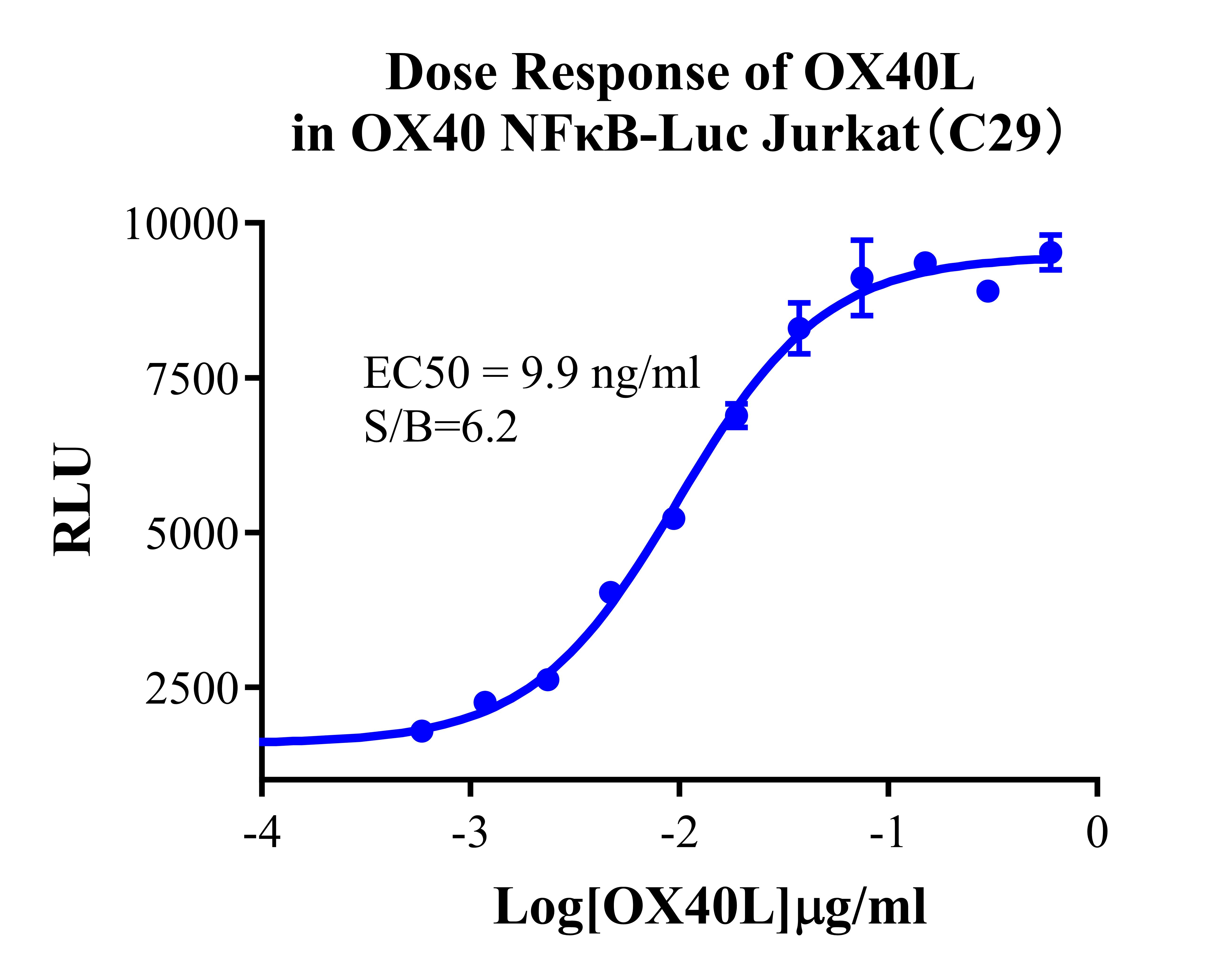Figure 3. Detect Luciferase assay by Ultra Luciferase Detection Kit CBPH0001(we strongly suggest to purchase from Cobioer). Dose response of OX40L in OX40 NFκB-Luc Jurkat(C29). |