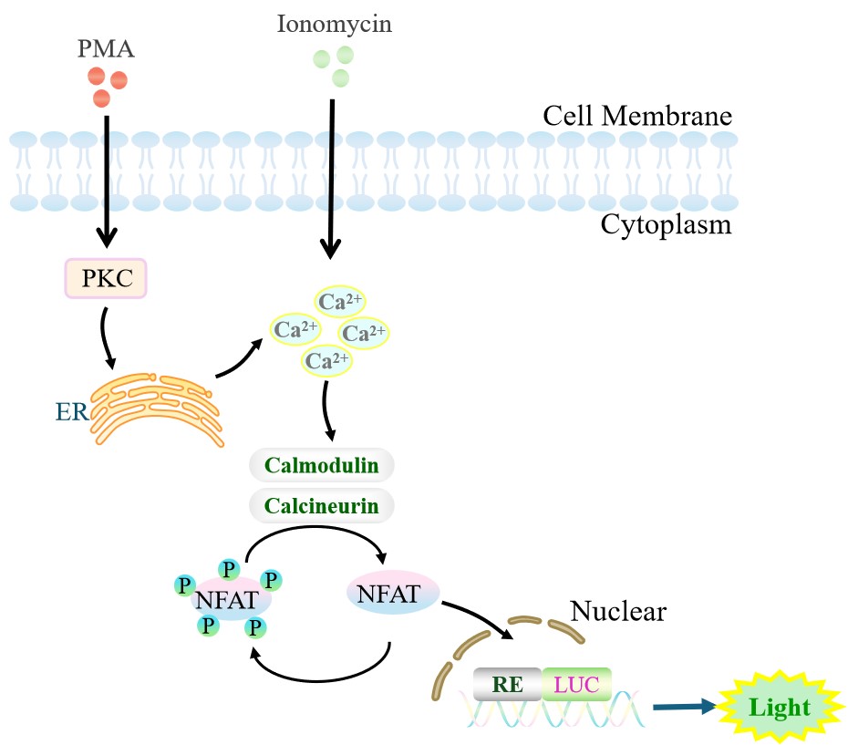 NFAT-Luc Jurkat 報告基因藥靶模型很好的模擬了體內(nèi) NFAT 的信號轉(zhuǎn)導過程,原理見下圖所示。