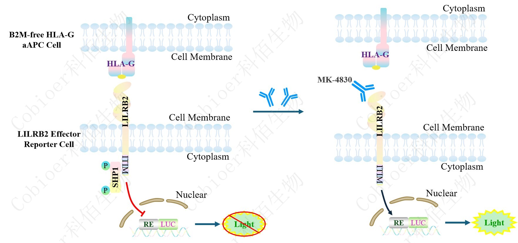 LILRB2 Effector Reporter Cell 報告基因藥靶模型很好的模擬了體內(nèi) LILRB2 的信號轉(zhuǎn)導(dǎo)過程,原理見下圖所示。![]() ![]() Figure 1. LILRB2 Effector Reporter Cell 模型原理圖 |