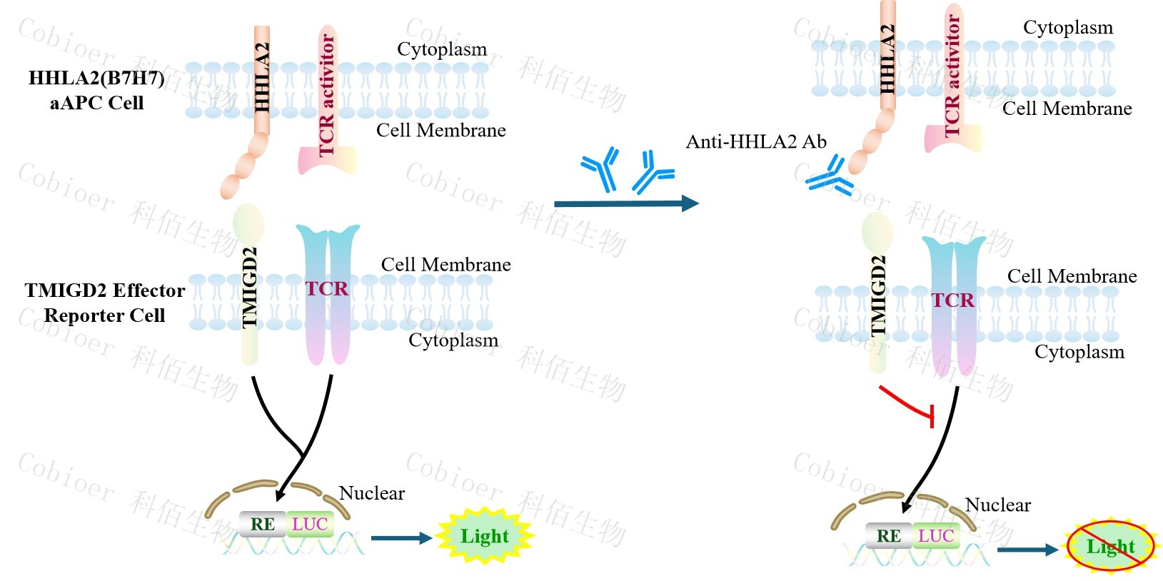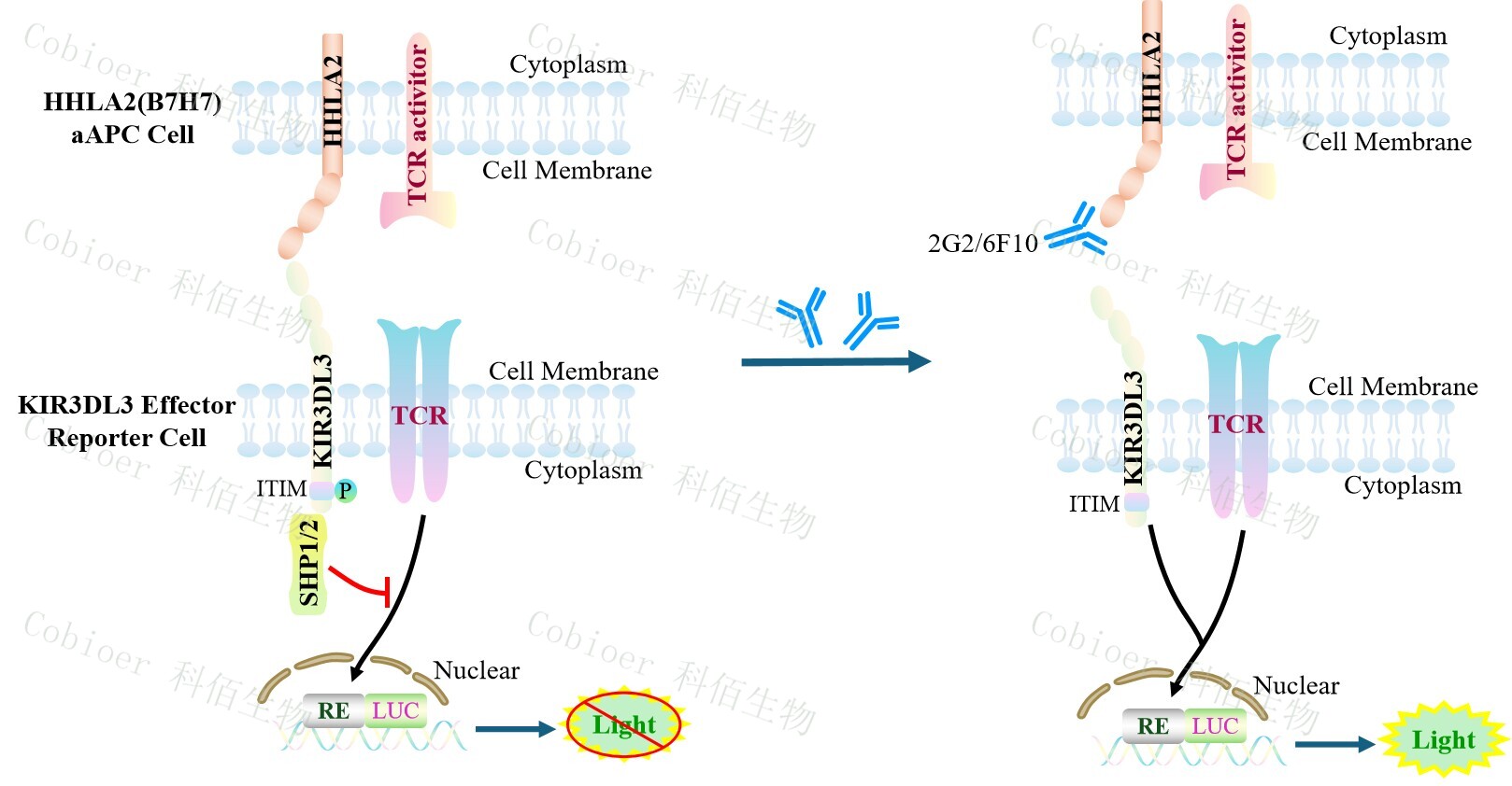 HHLA2(B7H7) aAPC Cell 作為 KIR3DL3 Effector Reporter Cell 或 TMIGD2 Effector Reporter Cell 的靶細胞 , 很好的模擬了體內(nèi) KIR3DL3/ HHLA2(B7H7) 或TMIGD2/HHLA2(B7H7)的信號轉(zhuǎn)導(dǎo)過程,原理見下圖所示。![]() ![]() Figure 1. HHLA2(B7H7) aAPC Cell 細胞模型原理圖 |