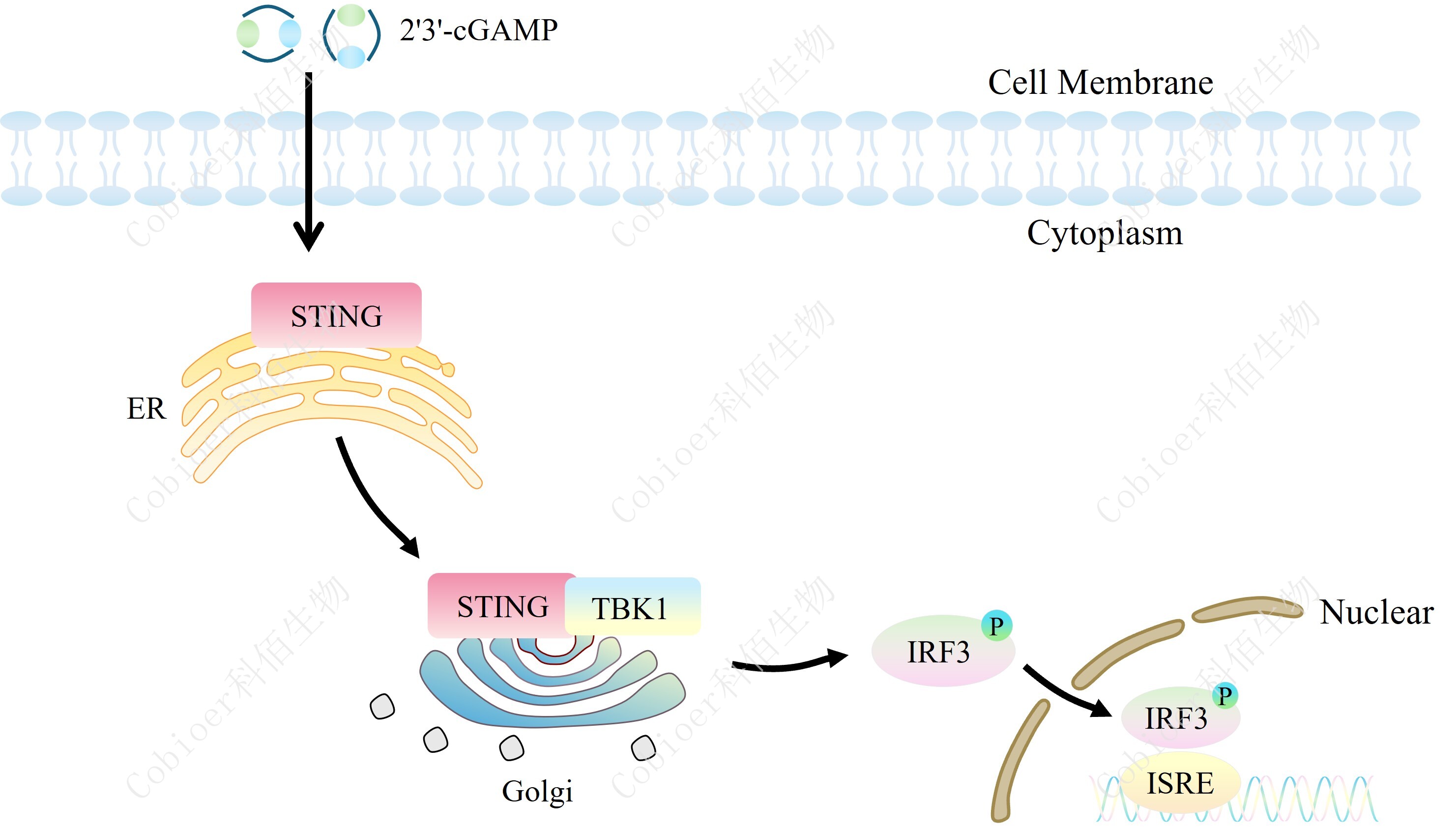 ISRE-Luc RAW264.7 報(bào)告基因細(xì)胞,是由 ISRE 調(diào)控并表達(dá) Luc 熒光素 酶報(bào)告基因的 RAW264.7 細(xì)胞。RAW264.7 是小鼠巨噬細(xì)胞的常用模型,用于研究細(xì)胞對 微生物及其產(chǎn)物的反應(yīng)。RAW 264.7 衍生細(xì)胞內(nèi)源性表達(dá)許多 PRR,包括 toll 樣受體 (TLR)、NOD 樣受體 (NLR)、RIG-I 樣受體 (RLR) 和 C 型凝集素受體 (CLR)。 STING 激活的原理見下圖所示。