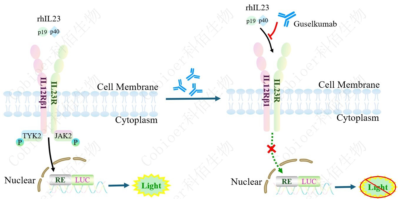IL23 Effector Reporter Cell 報(bào)告基因藥靶模型很好的模擬了體內(nèi) IL23 的信號轉(zhuǎn)導(dǎo)過程, 原理見下圖所示。 ![]() Figure 1. IL23 Effector Reporter Cell 細(xì)胞模型原理圖