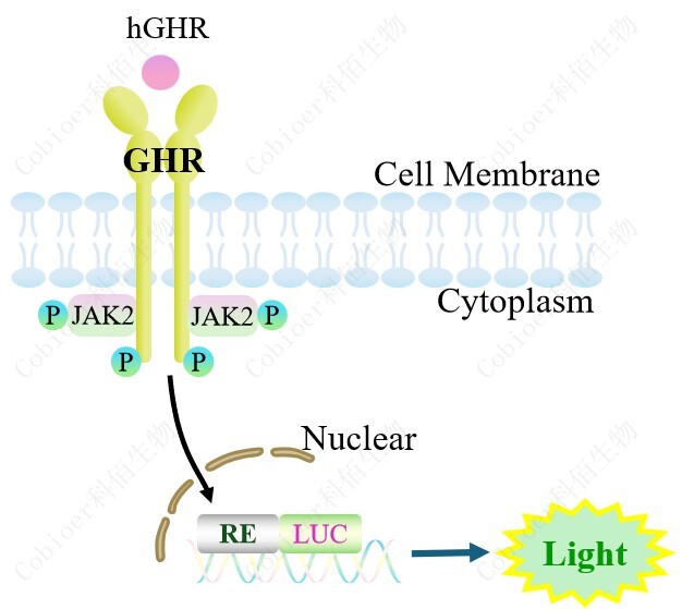 GHR Effector Reporter Cell 報(bào)告基因藥靶模型很好的模擬了體內(nèi) GHR 的信號(hào)轉(zhuǎn)導(dǎo)過(guò)程, 原理見(jiàn)下圖所示。![]() Figure 1. GHR Effector Reporter Cell 細(xì)胞模型原理圖 |