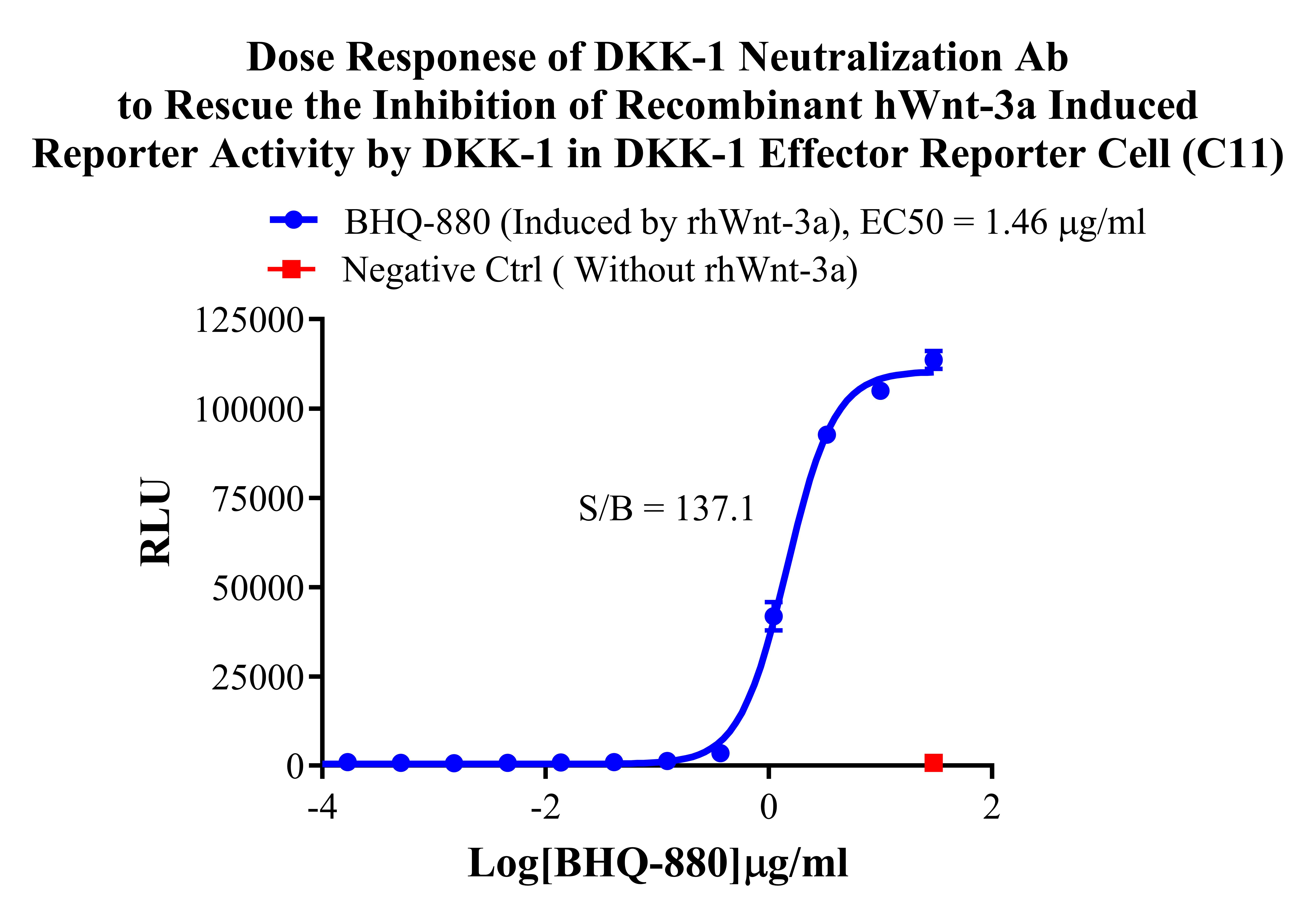 Figure 2.Dose Responese of DKK-1 Neutralization Ab to Rescue the Inhibition of Recombinant hWnt-3a Induced Reporter Activity by DKK-1 in DKK-1 Effector Reporter Cell(C11). |