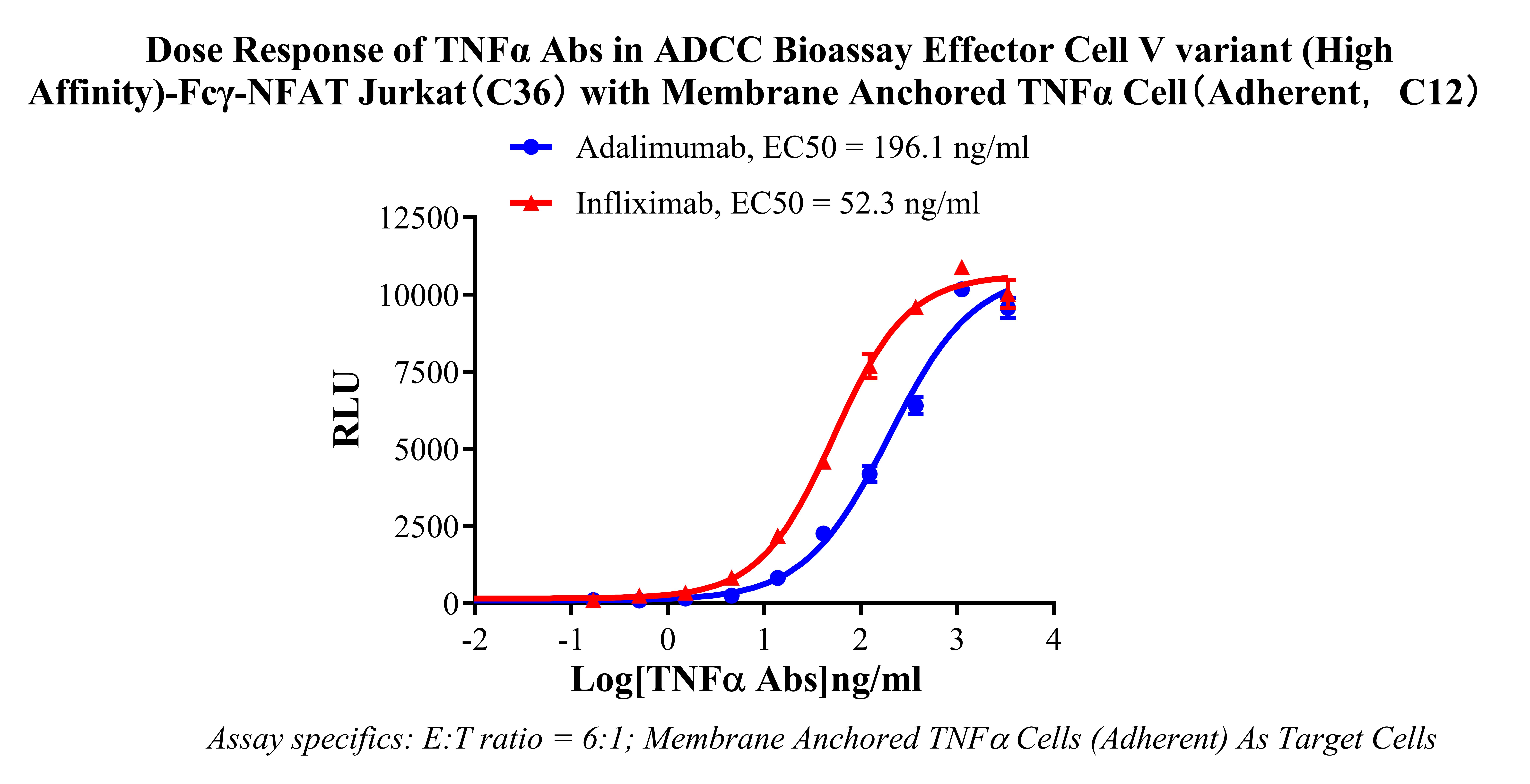 Figure 4. Dose response of TNFα Abs in ADCC Bioassay Effector Cell V variant(High Affinity)-Fcγ-NFAT Jurkat cell(C36)with Membrane Anchored TNFα Cell (Adherent,C12).