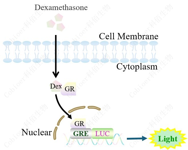GRE-Luc A549 報(bào)告基因細(xì)胞,是由 GRE 調(diào)控并表達(dá) Luc 熒光素酶報(bào)告 基 因的 A549 細(xì) 胞。 Dexamethasone (Hexadecadrol, 地 塞米 松)是 糖皮質(zhì)激素受體 (Glucocorticoid Receptor)激動(dòng)劑、凋亡誘導(dǎo)劑,原理見下圖所示。![]() Figure 1. GRE-Luc A549 細(xì)胞原理示意圖 |