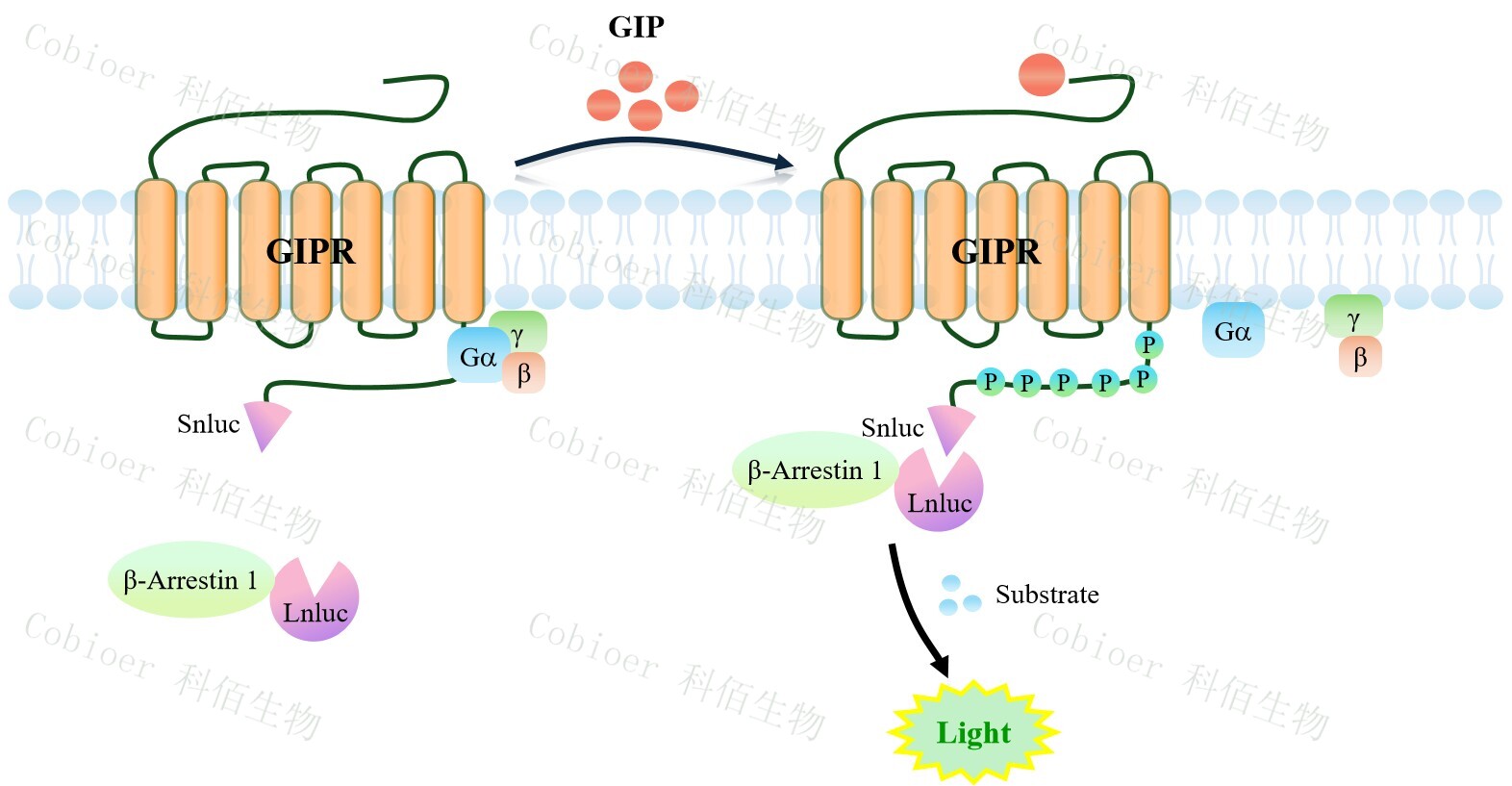 GIPR β-Arrestin 1 CHO 報(bào)告基因藥靶模型很好的模擬了體內(nèi) GIPR/β-Arrestin 1 的信號(hào) 轉(zhuǎn)導(dǎo)過程,原理見下圖所示。當(dāng)缺乏配體刺激時(shí),β-Arrestin 1 不與 GIPR 結(jié)合,融合β- Arrestin 1 的熒光素酶處于失活構(gòu)象,當(dāng) GIPR 遭遇配體刺激時(shí),融合熒光素酶報(bào)告基因的 β-Arrestin 1 被招募,使熒光素酶報(bào)告基因處于激活狀態(tài),加入其底物后發(fā)光信號(hào)增強(qiáng)。![]() Figure 1. GIPR β-Arrestin 1 CHO 細(xì)胞模型原理圖 |