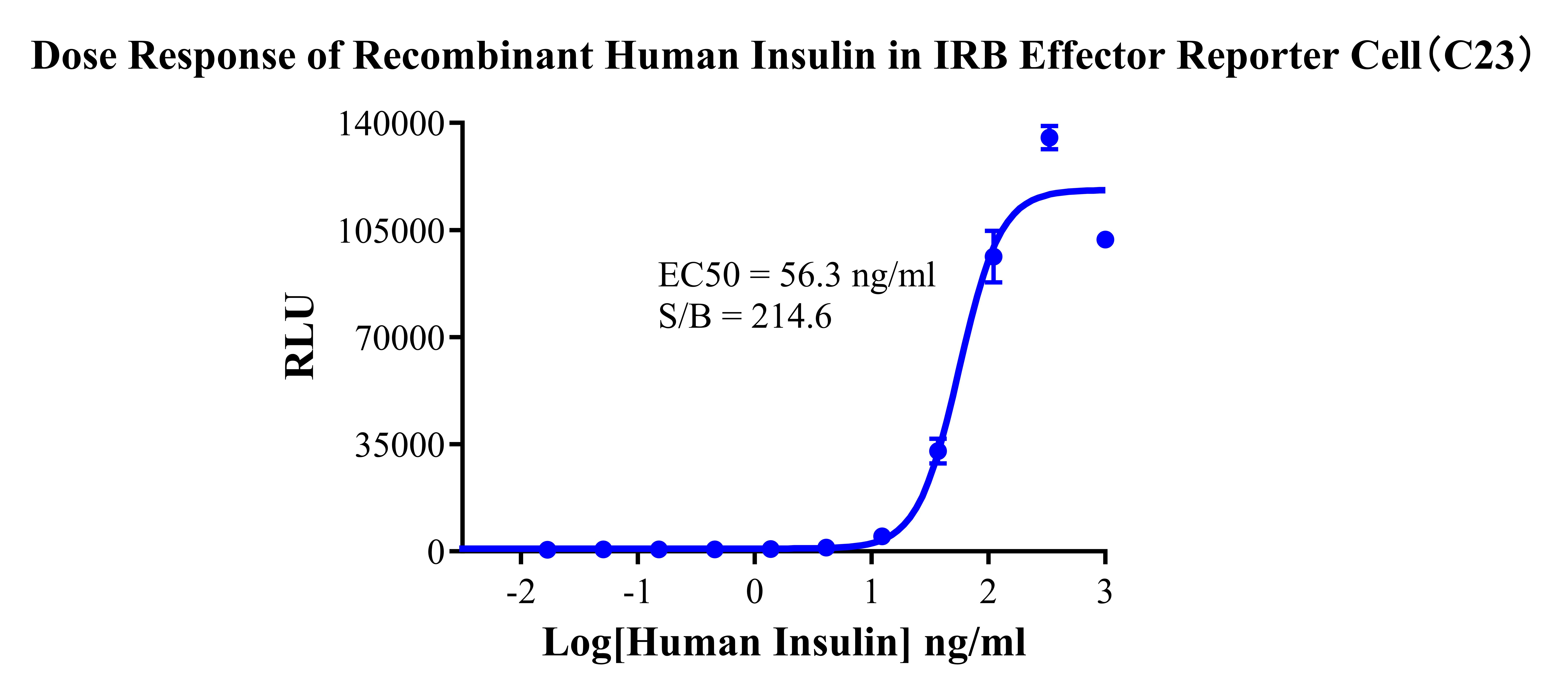 IV. Representative Data![]() Figure 2. Recombinant IRB Effector Reporter Cell stably expressing IRB. ![]() Figure 3. Dose Response of Recombinant Human Insulin in IRB Effector Reporter Cell (C23). |