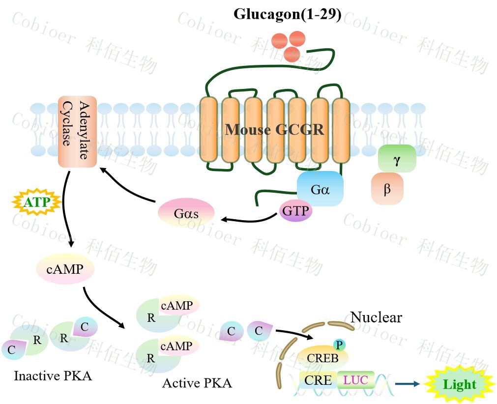Mouse GCGR CRE-Luc HEK293 報告基因藥靶模型很好的模擬了體內(nèi) GCGR 的信號轉(zhuǎn)導過程,原理見下圖所示。
