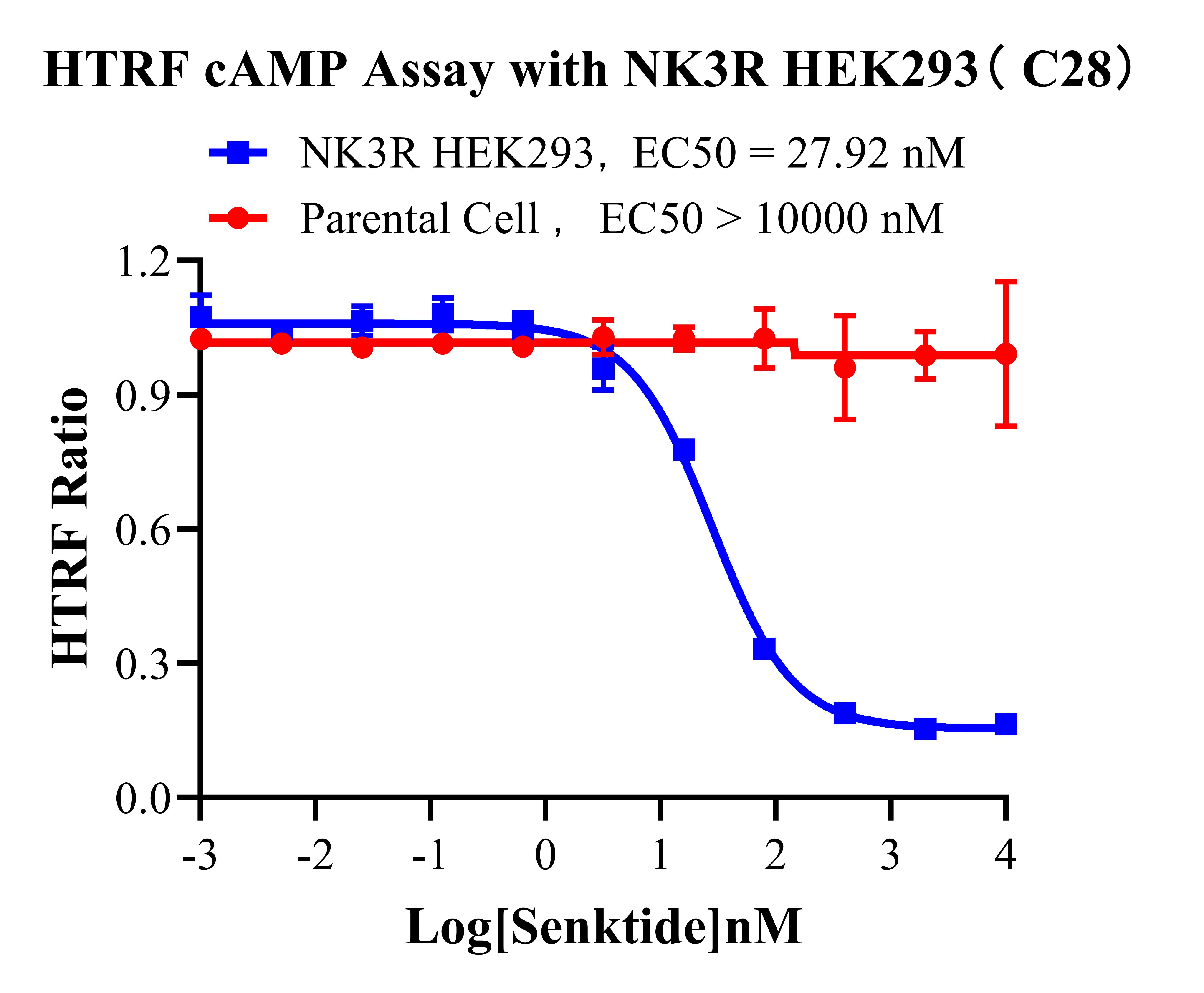 cAMP 在 G 蛋白偶聯(lián)受體(GPCR)信號(hào)轉(zhuǎn)導(dǎo)中是一種關(guān)鍵的第二信使。當(dāng)配體結(jié)合 到 GPCR,構(gòu)象發(fā)生變化,激活受體接著激活 G 蛋白,Gs 的激活導(dǎo)致腺苷酸環(huán)化酶調(diào)控 cAMP 的升高。NK3R HEK293 細(xì)胞藥靶模型很好的模擬了體內(nèi) NK3R 的信號(hào)轉(zhuǎn)導(dǎo)過程,原 理見下圖所示。