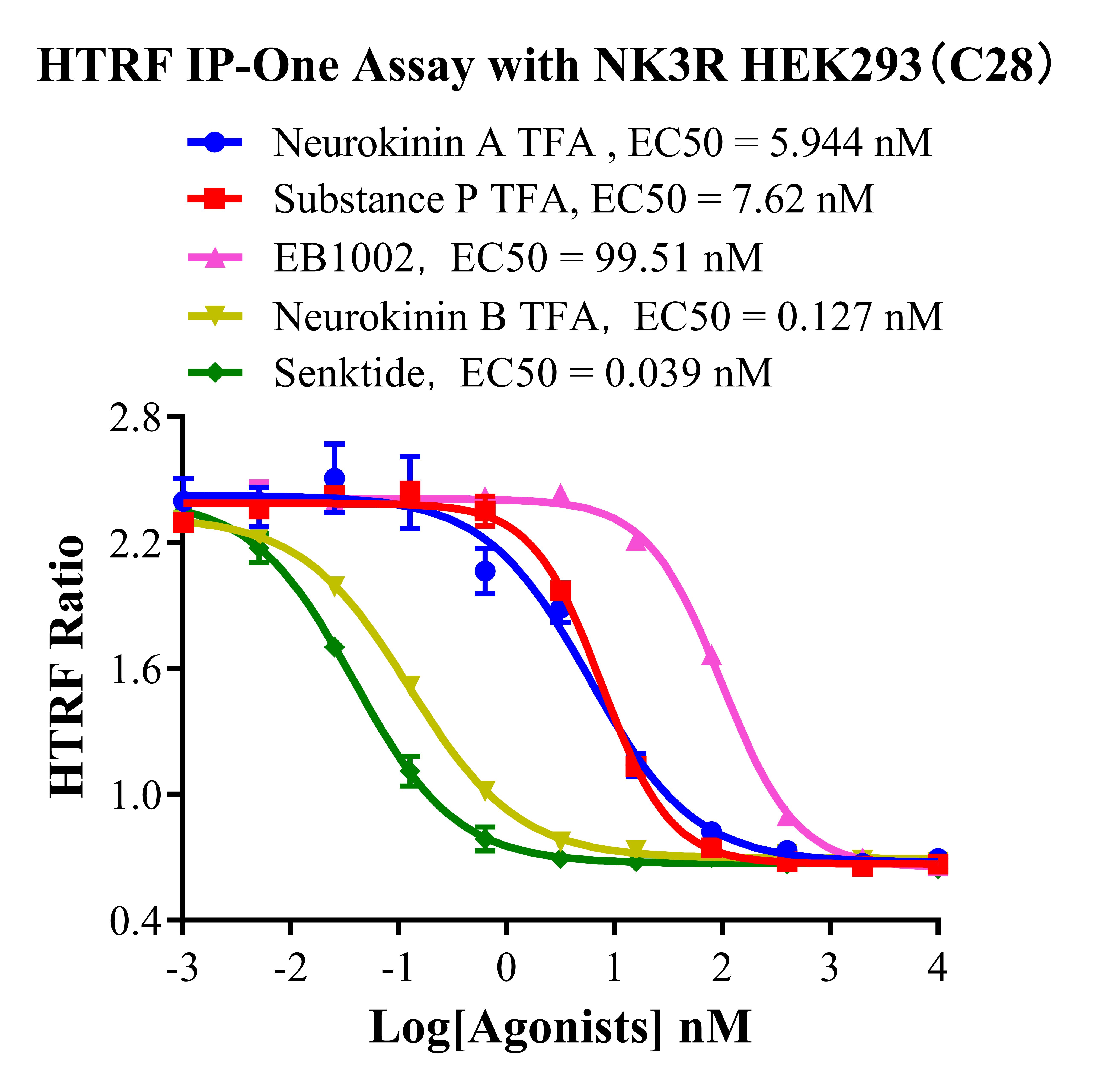 速激肽(Tachykinin)是在整個(gè)神經(jīng)和免疫系統(tǒng)中表達(dá)的神經(jīng)肽,作為興奮性神經(jīng)遞質(zhì), 它們?cè)谡{(diào)節(jié)各種生理功能中發(fā)揮重要的作用。在不同的速激肽中,P 物質(zhì)(SP)、神經(jīng)激 肽 A(NKA) 和 NKB 已得到充分研究。這些肽可以通過三種不同的 GPCR、神經(jīng)激肽 1 受體(NK1R)、神經(jīng)激肽 2 受體(NK2R) 和 NK3R 發(fā)揮作用。作為具有不同親和力的 完全激動(dòng)劑。 NK3R(Neurokinin 3 Receptor),又稱 TACR3,是速激肽受體家族的重要成員,屬于 GPCR 超家族。其內(nèi)源性配體為神經(jīng)激肽 B(Neurokinin B, NKB),通過激活下游信號(hào)通 路參與生殖調(diào)控、神經(jīng)內(nèi)分泌調(diào)節(jié)及多種疾病進(jìn)程。近年來,NK3R 成為治療更年期癥狀、 神經(jīng)精神疾病及癌癥的熱門靶點(diǎn)。 |