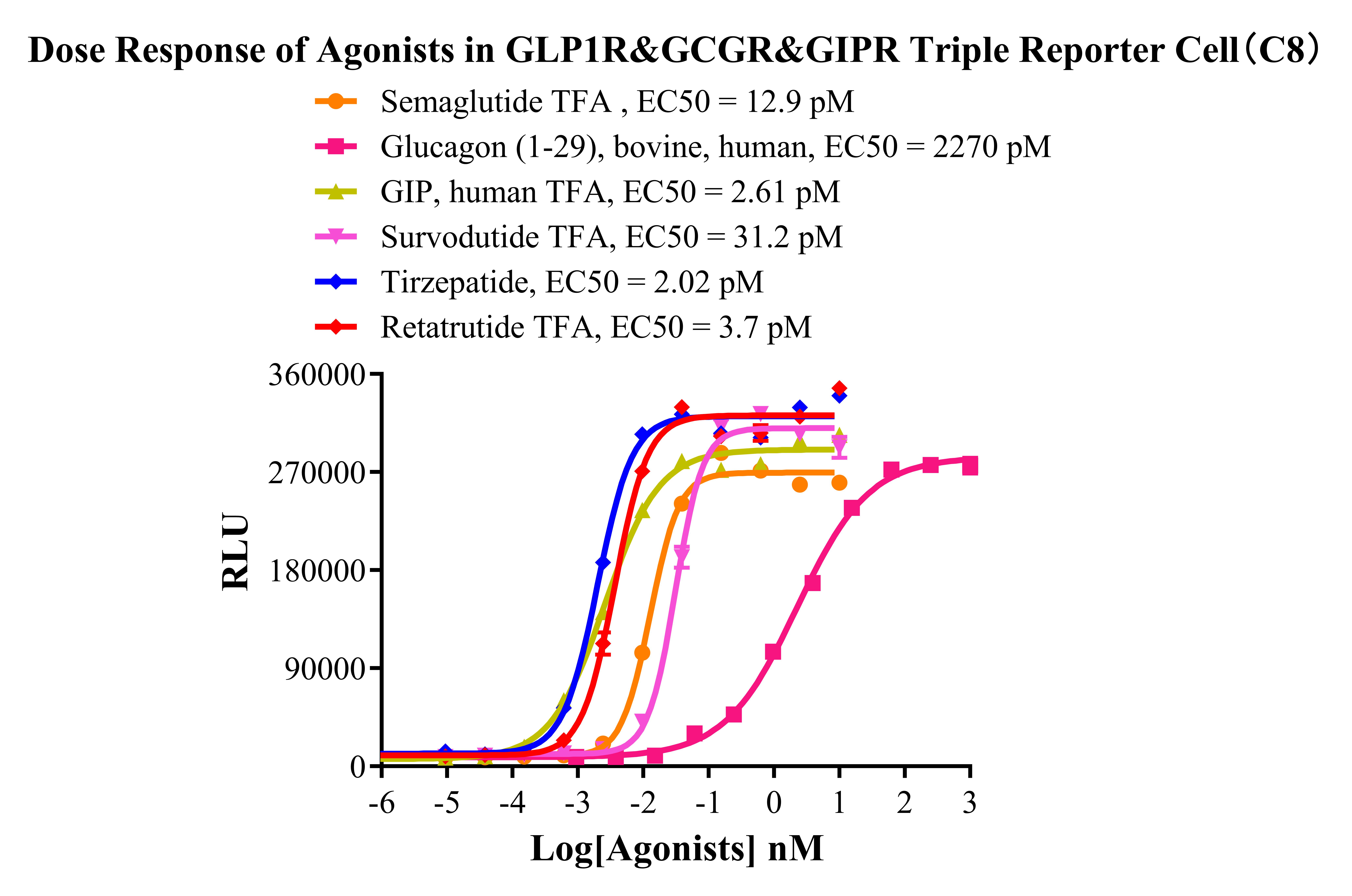 IV. Representative Data![]() Figure 2. Recombinant GLP1R&GCGR&GIPR Triple Reporter Cell stably expressing GLP1R&GCGR&GIPR. ![]() Figure 3. Dose Response of Agonists in GLP1R&GCGR&GIPR Triple Reporter Cell(C8. |