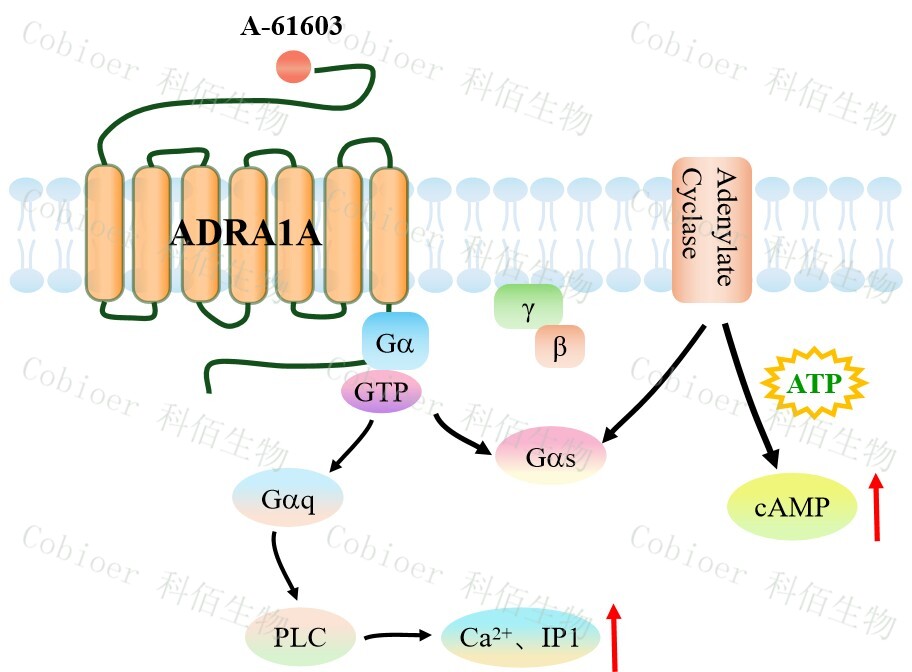 ADRA1A 還可以通過(guò) Gq 蛋白的信號(hào)通路,調(diào)控 IP1 的升高。ADRA1A 與配體結(jié)合, 導(dǎo)致 Gαq 亞基的激活,觸發(fā) PLC-γ,從而產(chǎn)生兩個(gè)第二信使:IP3 和 DAG,它們參與細(xì)胞 內(nèi)鈣動(dòng)員。由于 IP3 在代謝上不穩(wěn)定,因此測(cè)量通路激活的替代標(biāo)志物 IP1 作為檢測(cè)標(biāo)準(zhǔn)。