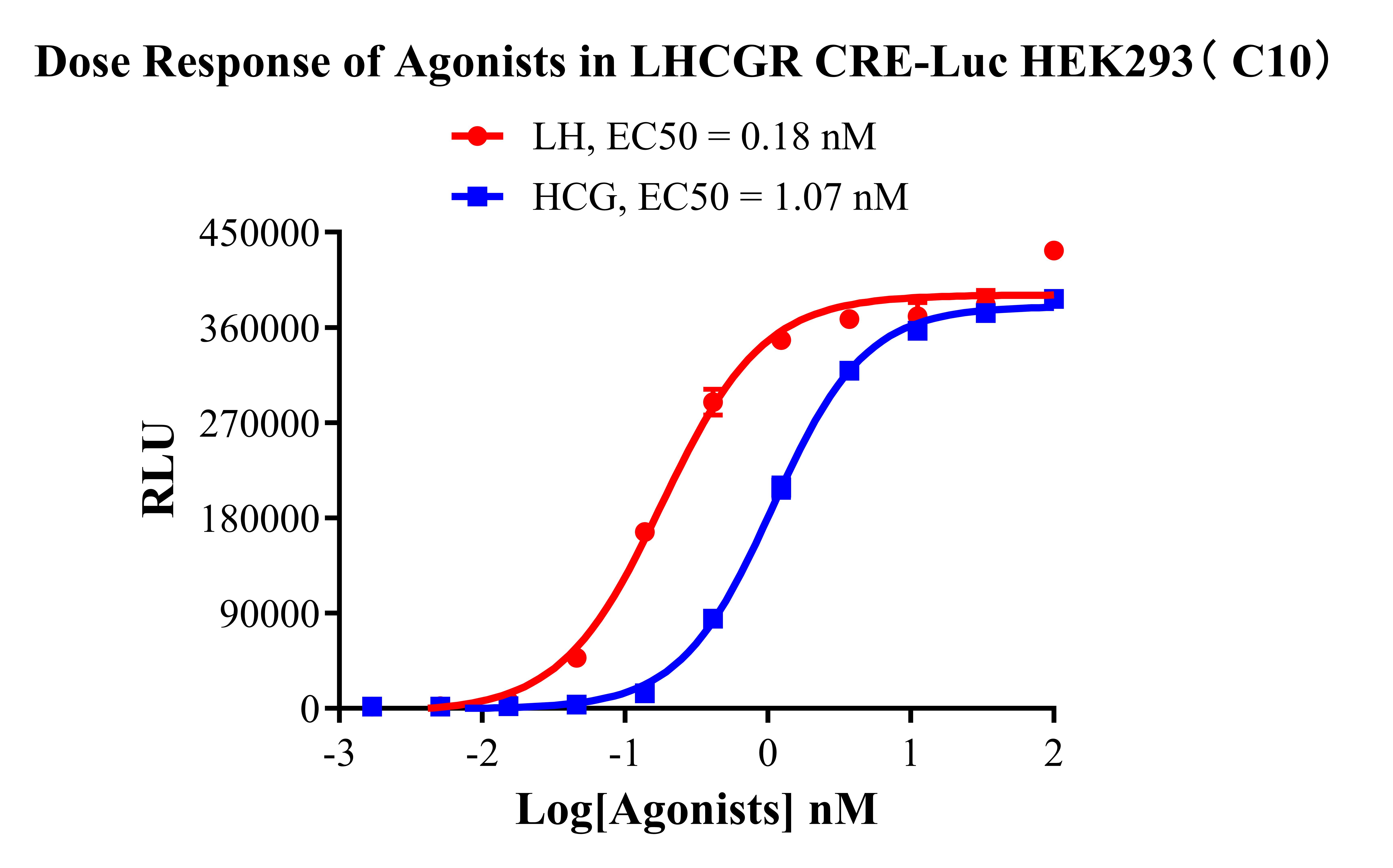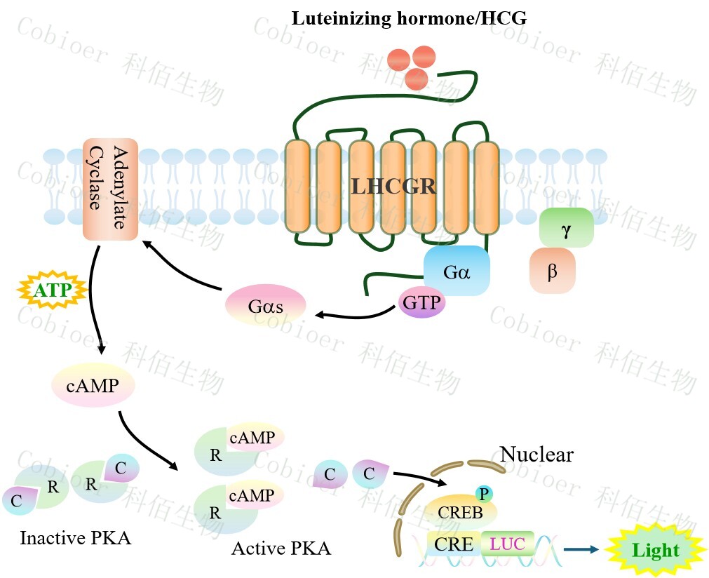 LHCGR CRE-Luc HEK293 報告基因藥靶模型很好的模擬了體內(nèi) LHCGR 的信號轉(zhuǎn)導過程,原理見下圖所示。![]() Figure 1. LHCGR CRE-Luc HEK293 細胞模型原理圖 |