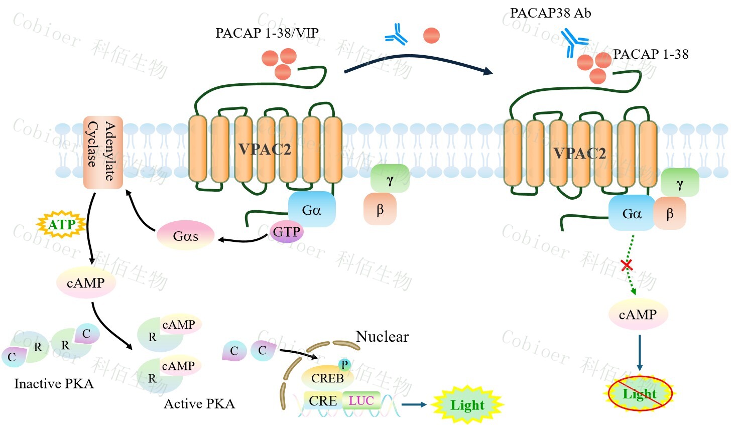 | PACAP/VIP 受體家族屬于 B 類 G 蛋白偶聯(lián)受體(GPCR),包含 PAC1R (PAC1)、 VPAC1R (VPAC1) 和 VPAC2R (VPAC2) 三個(gè)亞型,共同響應(yīng)神經(jīng)肽 PACAP(垂體腺苷酸 環(huán)化酶激活肽)和 VIP(血管活性腸肽)的調(diào)控,通過激活 Gs/cAMP-PKA 核心信號軸 (部分亞型偶聯(lián) Gq/PLC)廣泛協(xié)調(diào)神經(jīng)內(nèi)分泌、代謝穩(wěn)態(tài)與免疫調(diào)節(jié)。 VPAC2 受體(血管活性腸肽受體 2 型)作為 B 類 GPCR 的核心亞型,主要富集于下丘 腦視交叉上核(SCN)、胰腺β細(xì)胞、脂肪組織及骨細(xì)胞,以同等高親和力結(jié)合 VIP 和 PACAP,通過 Gs/cAMP-PKA 通路調(diào)控代謝穩(wěn)態(tài)與晝夜節(jié)律。VPAC2 的激活可同步 SCN 生物鐘基因(如 Per2)振蕩以維持睡眠-覺醒周期、促進(jìn)胰島素/胰高血糖素脈沖式分泌調(diào) 控血糖平衡、抑制破骨細(xì)胞分化并增強(qiáng)骨形成。 | |