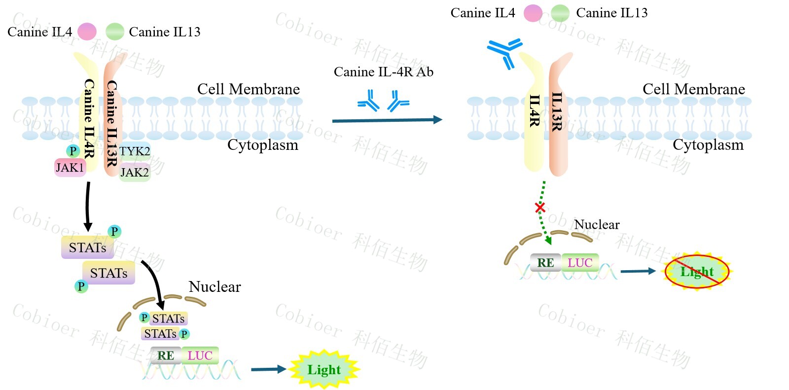 Canine IL4/IL13 Dual Effector Reporter Cell 報(bào)告基因藥靶模型很好的模擬了體內(nèi) IL4/IL13 的信號(hào)轉(zhuǎn)導(dǎo)過(guò)程,原理見(jiàn)下圖所示。![]() Figure 1. Canine IL4/IL13 Dual Effector Reporter Cell 細(xì)胞模型原理圖 |