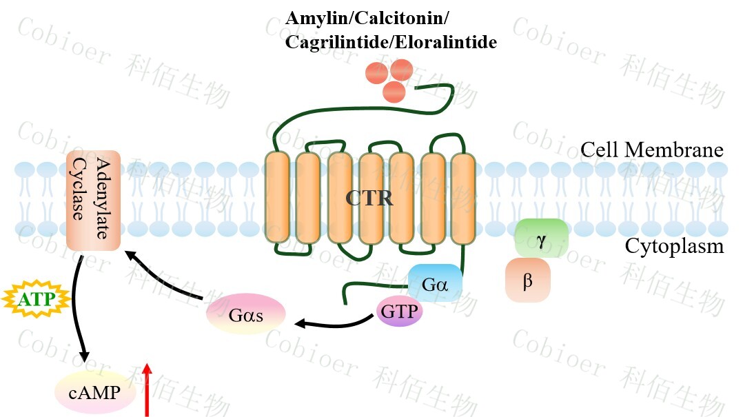 | 降鈣素基因相關(guān)肽(CGRP)家族包括 CGRP 本身、降鈣素(CT)、腎上腺髓質(zhì)素 (AM)和胰島淀粉樣肽(AMY)。 胰淀素(Amylin)受體的三種類型的已被確定,即 AMY1,AMY2 和 AMY3。胰淀素 受體屬于 B 類 GPCR,是異二聚體復(fù)合物,由降鈣素受體(CTR)與受體活性修飾蛋白 (RAMPs)結(jié)合形成。該受體的 CTR 組分具有相同的 GPCR 結(jié)構(gòu):7 個(gè)跨膜相互連接的α- 螺旋,將細(xì)胞外信號(hào)傳遞到細(xì)胞內(nèi)細(xì)胞質(zhì)信號(hào)級(jí)聯(lián)。RAMP 有三種類型(RAMP1、 RAMP2 和 RAMP3),它們共享 31%的氨基酸序列,具有相似的基本結(jié)構(gòu)。RAMP 是將 CTR 轉(zhuǎn)運(yùn)到細(xì)胞膜并調(diào)節(jié)其配體特異性的重要肽,它可以改變特定 GPCR 的藥理學(xué)、功能 和細(xì)胞運(yùn)輸。 哺乳動(dòng)物細(xì)胞中 Amylin 受體的激活已被證明可以提高 cAMP,并被認(rèn)為與 Gs 蛋白和 腺苷酸環(huán)化酶的刺激有關(guān)。在 RAMPs 的存在下,其與胰淀素的結(jié)合親和力可以被修飾。 CTR 和 RAMP1 或 CTR 和 RAMP3 的異質(zhì)結(jié)構(gòu)被認(rèn)為有利于與胰淀素結(jié)合,介導(dǎo)大腦中的 生理功能。AMY3 的激活刺激 G 蛋白 Gαs,進(jìn)一步控制腺苷酸環(huán)化酶(AC),隨后增加細(xì) 胞 cAMP。cAMP 與 PKA 調(diào)控亞基(R2)的結(jié)合誘導(dǎo) PKA 四聚體全酶解離,導(dǎo)致 PKA 催 化亞基的激活。cAMP 激活的 PKA 參與調(diào)控 ERK1/2 的活性。ERK1/2 通路的觸發(fā)可能導(dǎo)致 Ca 2+分布不均勻,引發(fā)內(nèi)質(zhì)網(wǎng)和線粒體功能障礙,導(dǎo)致細(xì)胞死亡。此外,cAMP 刺激 AKT 進(jìn)一步導(dǎo)致轉(zhuǎn)錄因子 cFos 的表達(dá)。 |