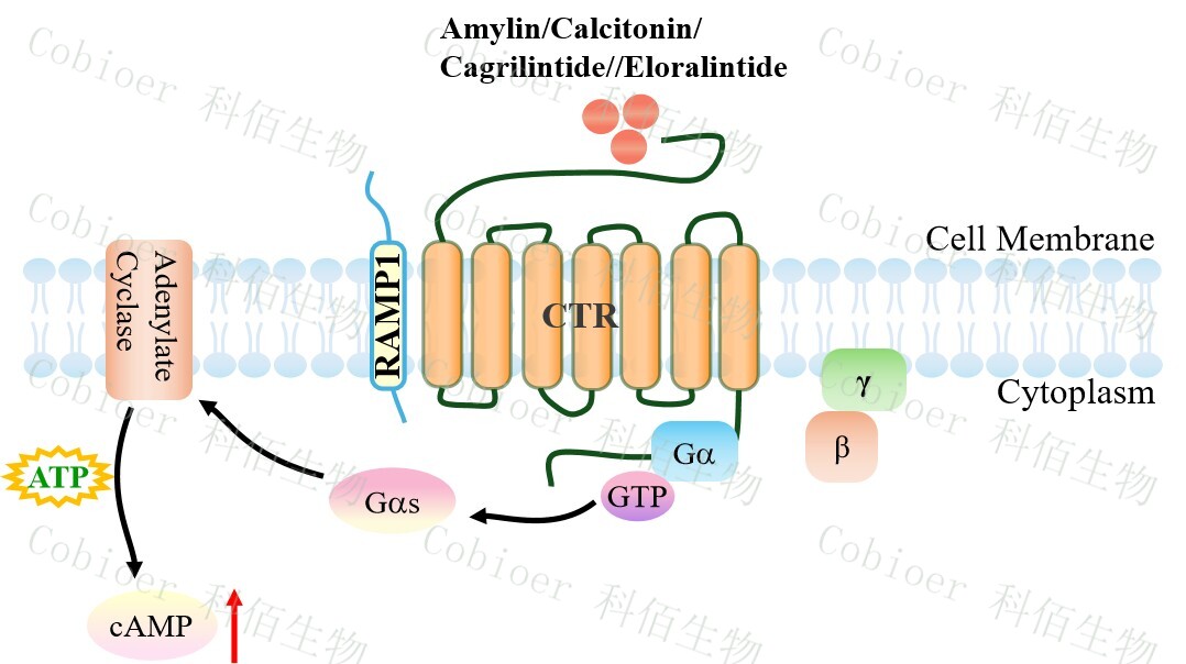| 降鈣素基因相關(guān)肽(CGRP)家族包括 CGRP 本身、降鈣素(CT)、腎上腺髓質(zhì)素 (AM)和胰島淀粉樣肽(AMY)。 胰淀素(Amylin)受體的三種類型的已被確定,即 AMY1,AMY2 和 AMY3。胰淀素 受體屬于 B 類 GPCR,是異二聚體復(fù)合物,由降鈣素受體(CTR)與受體活性修飾蛋白 (RAMPs)結(jié)合形成。該受體的 CTR 組分具有相同的 GPCR 結(jié)構(gòu):7 個跨膜相互連接的α- 螺旋,將細胞外信號傳遞到細胞內(nèi)細胞質(zhì)信號級聯(lián)。RAMP 有三種類型(RAMP1、 RAMP2 和 RAMP3),它們共享 31%的氨基酸序列,具有相似的基本結(jié)構(gòu)。RAMP 是將 CTR 轉(zhuǎn)運到細胞膜并調(diào)節(jié)其配體特異性的重要肽,它可以改變特定 GPCR 的藥理學、功能 和細胞運輸。 哺乳動物細胞中 Amylin 受體的激活已被證明可以提高 cAMP,并被認為與 Gs 蛋白和 腺苷酸環(huán)化酶的刺激有關(guān)。在 RAMPs 的存在下,其與胰淀素的結(jié)合親和力可以被修飾。 CTR 和 RAMP1 或 CTR 和 RAMP3 的異質(zhì)結(jié)構(gòu)被認為有利于與胰淀素結(jié)合,介導(dǎo)大腦中的 生理功能。AMY3 的激活刺激 G 蛋白 Gαs,進一步控制腺苷酸環(huán)化酶(AC),隨后增加細 胞 cAMP。cAMP 與 PKA 調(diào)控亞基(R2)的結(jié)合誘導(dǎo) PKA 四聚體全酶解離,導(dǎo)致 PKA 催 化亞基的激活。cAMP 激活的 PKA 參與調(diào)控 ERK1/2 的活性。ERK1/2 通路的觸發(fā)可能導(dǎo)致 Ca 2+分布不均勻,引發(fā)內(nèi)質(zhì)網(wǎng)和線粒體功能障礙,導(dǎo)致細胞死亡。此外,cAMP 刺激 AKT 進一步導(dǎo)致轉(zhuǎn)錄因子 cFos 的表達。 |