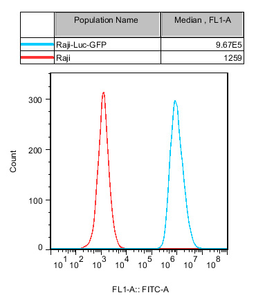 ![]() Figure 1. Recombinant Raji-Luc-GFP constitutively expressing GFP. ![]() |