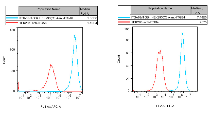 ![]() Figure 1. Recombinant ITGA6&ITGB4 HEK293 stably expressing ITGA6&ITGB4.