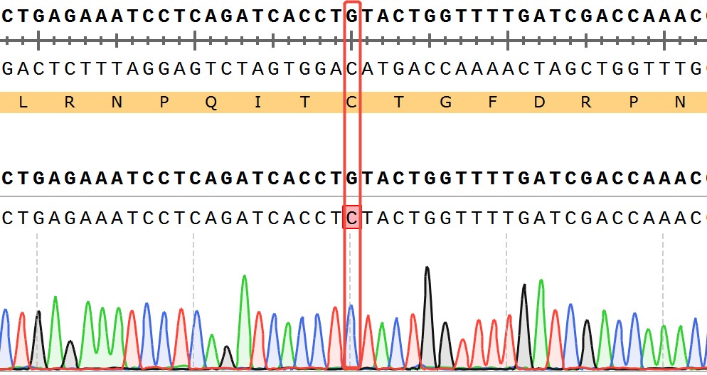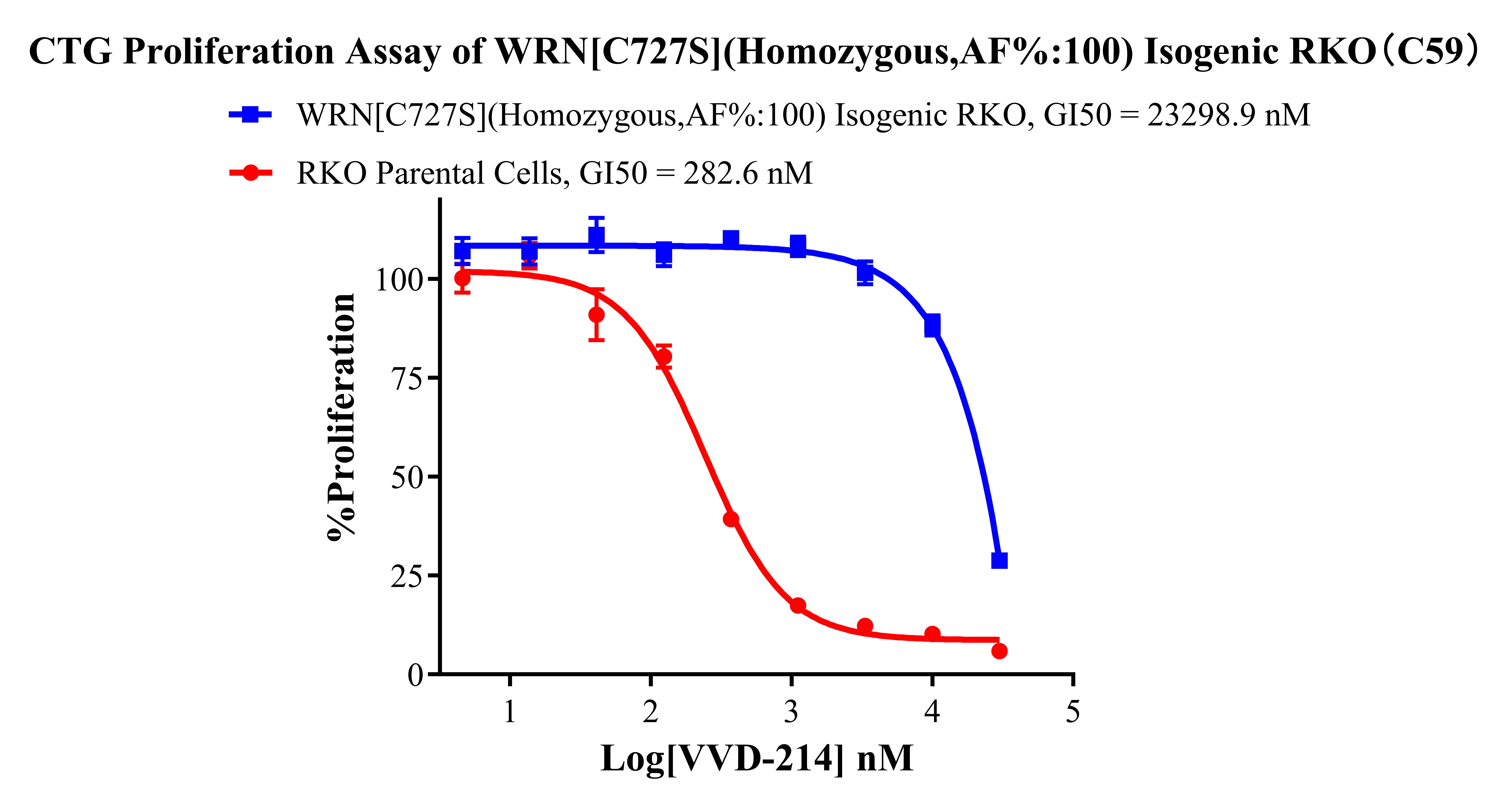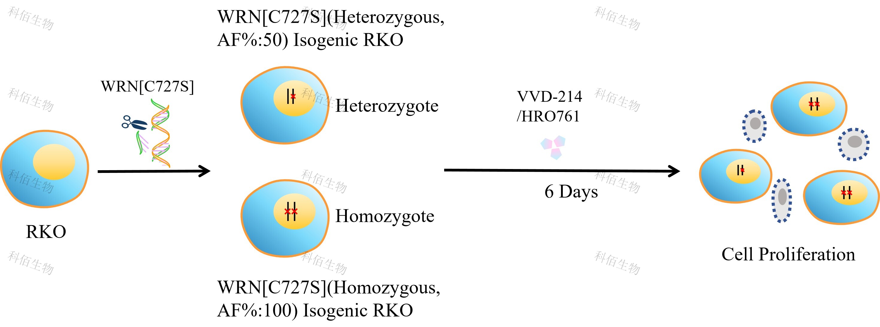 WRN[C727S](Homozygous,AF%:100) Isogenic RKO藥靶細胞,通過基因 編輯的方式將WRN的727位氨基酸半胱氨酸(C)突變?yōu)榻z氨酸(S)。![]() Figure 1. WRN[C727S](Homozygous,AF%:100) Isogenic RKO原理示意圖 |