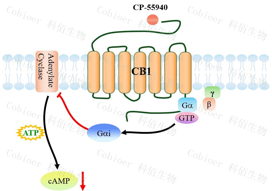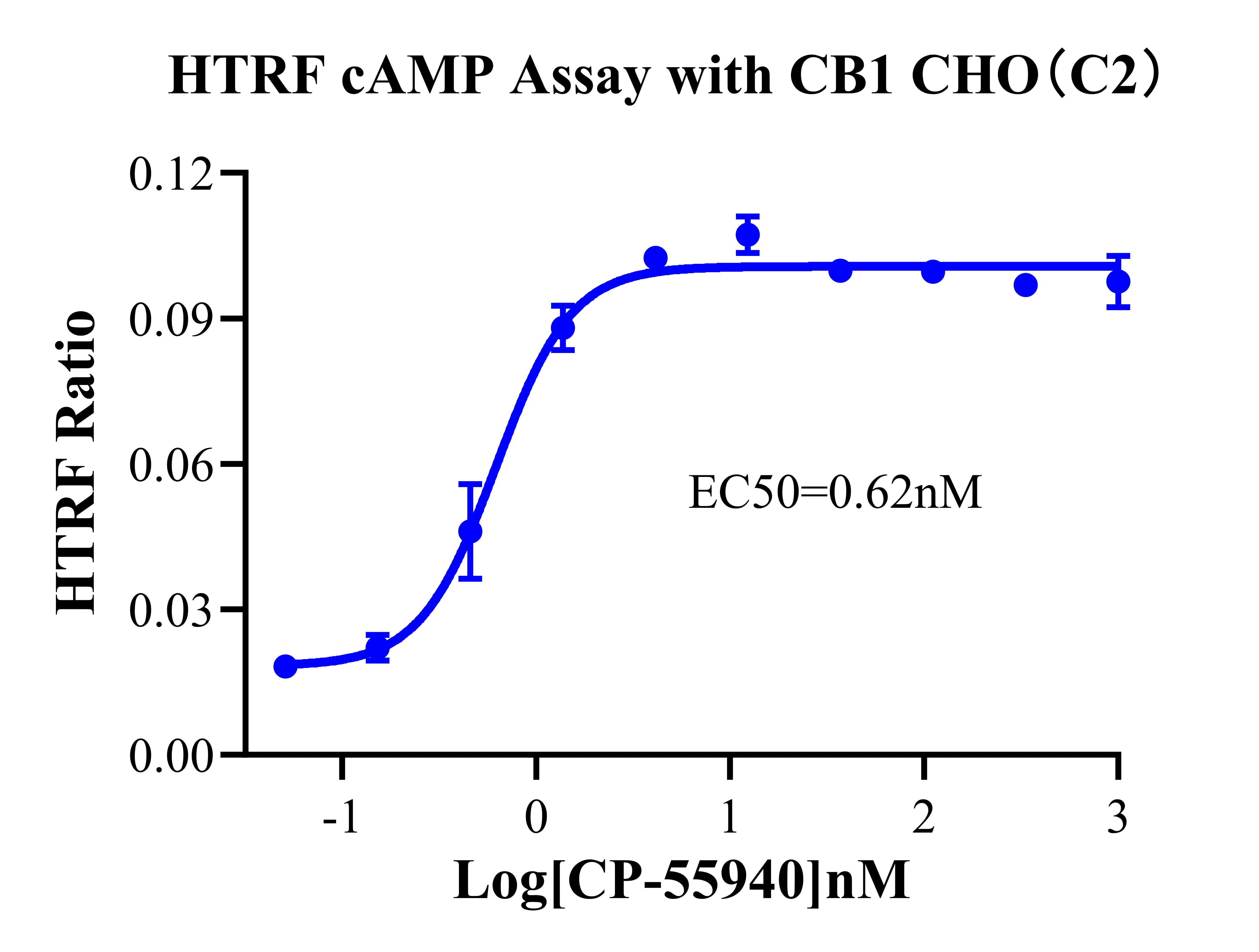 cAMP 在 G 蛋白偶聯(lián)受體(GPCR)信號轉(zhuǎn)導(dǎo)中是一種關(guān)鍵的第二信使。當配體結(jié)合到 GPCR,構(gòu)象發(fā)生變化,激活受體接著激活 G 蛋白,Gi 的激活導(dǎo)致腺苷酸環(huán)化酶調(diào)控 cAMP 的下調(diào)。CB1 CHO 藥靶模型很好的模擬了體內(nèi) CB1 的信號轉(zhuǎn)導(dǎo)過程,原理見下圖所示。![]() Figure 1. CB1 CHO 細胞模型原理圖