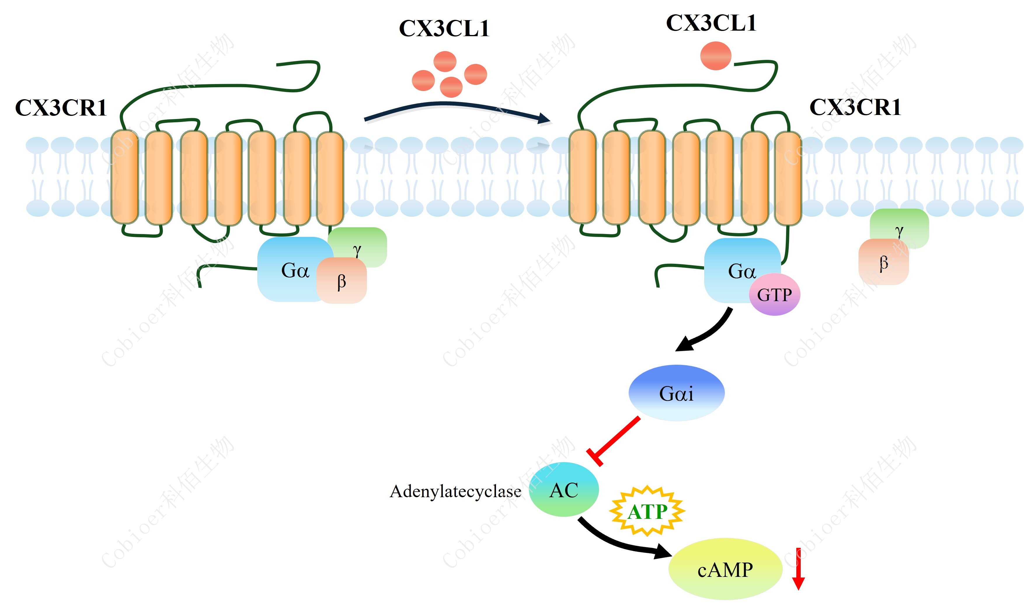 cAMP 在 G 蛋白偶聯(lián)受體(GPCR)信號轉導中是一種關鍵的第二信使。當配體結合到 GPCR,構象發(fā)生變化,激活受體接著激活G蛋白,Gi的激活導致腺苷酸環(huán)化酶調控 cAMP 的下調。CX3CR1藥靶模型很好的模擬了體內CX3CR1的信號轉導過程,原理見下圖所示。![]() Figure 1. CX3CR1 CHO 細胞模型原理圖 |