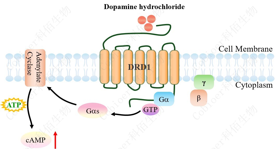 cAMP 在 G 蛋白偶聯(lián)受體(GPCR)信號轉導中是一種關鍵的第二信使。當配體結合 到 GPCR,構象發(fā)生變化,激活受體接著激活 G 蛋白,Gs 的激活導致腺苷酸環(huán)化酶調(diào)控 cAMP 的升高。DRD1 CHO 藥靶模型很好的模擬了體內(nèi) DRD1 的信號轉導過程,原理見下圖所示。![]() Figure 1. DRD1 CHO 細胞模型原理 |