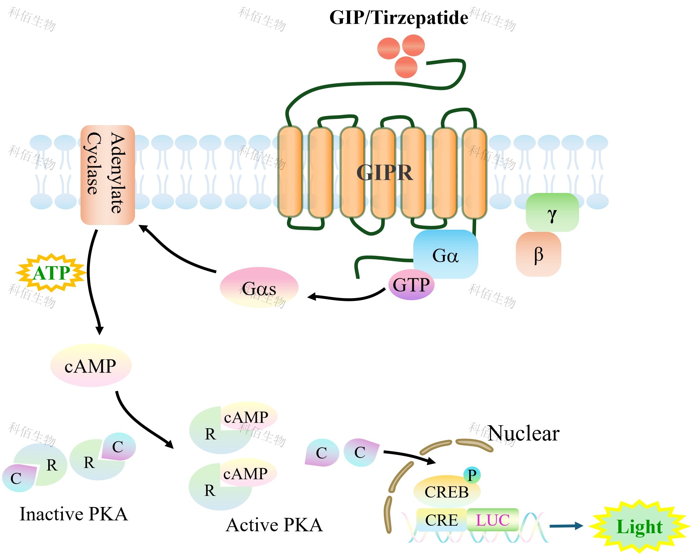 GIPR CRE-Luc HEK293 報(bào)告基因藥靶模型很好的模擬了體內(nèi) GIPR 的信號(hào)轉(zhuǎn)導(dǎo)過(guò)程, 原理見(jiàn)下圖所示。