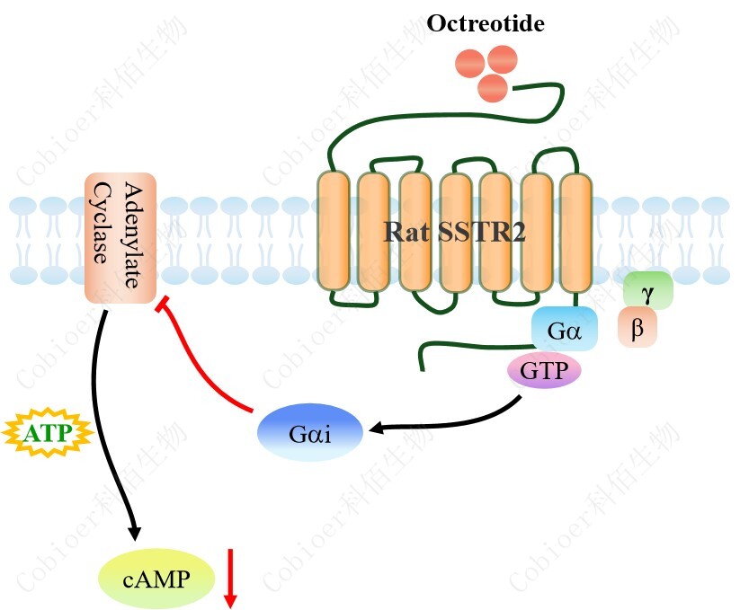 cAMP 在 G 蛋白偶聯(lián)受體(GPCR)信號(hào)轉(zhuǎn)導(dǎo)中是一種關(guān)鍵的第二信使。當(dāng)配體結(jié)合 到 GPCR,構(gòu)象發(fā)生變化,激活受體接著激活 G 蛋白,Gi 的激活導(dǎo)致腺苷酸環(huán)化酶調(diào)控 cAMP 的下調(diào)。Rat SSTR2 CHO 藥靶模型很好的模擬了體內(nèi) SSTR2 的信號(hào)轉(zhuǎn)導(dǎo)過程,原理 見下圖所示。![]() Figure 1. Rat SSTR2 CHO 細(xì)胞模型原理圖 |