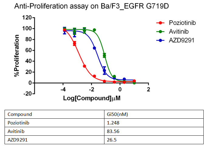 Figure 3. Anti-proliferation assay of three reference compounds on the EGFR G719D/BaF3 Stable Cell Line. |