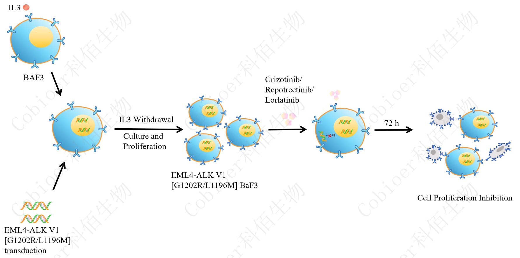 BaF3(小鼠原 B 細(xì)胞)的生長和增殖需要 IL-3 的維持。通過引入各種表達(dá)激酶的基因, 能作為 BaF3 的驅(qū)動基因,讓 BaF3 不再依賴 IL-3 而增殖,進(jìn)而激酶基因成為 BaF3 增殖依 賴的驅(qū)動基因,用于評估小分子藥物對激酶的靶向抑制作用,原理及流程見下圖所示。