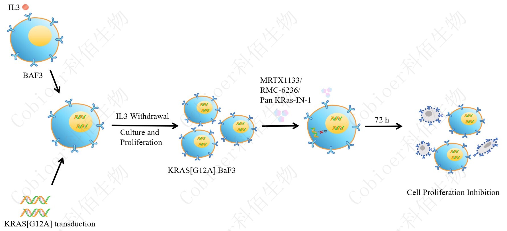 BaF3(小鼠原 B 細(xì)胞)的生長和增殖需要 IL-3 的維持。通過引入各種表達激酶的基因, 能作為 BaF3 的驅(qū)動基因,讓 BaF3 不再依賴 IL-3 而增殖,進而激酶基因成為 BaF3 增殖依 賴的驅(qū)動基因,用于評估小分子藥物對激酶的靶向抑制作用,原理及流程見下圖所示。