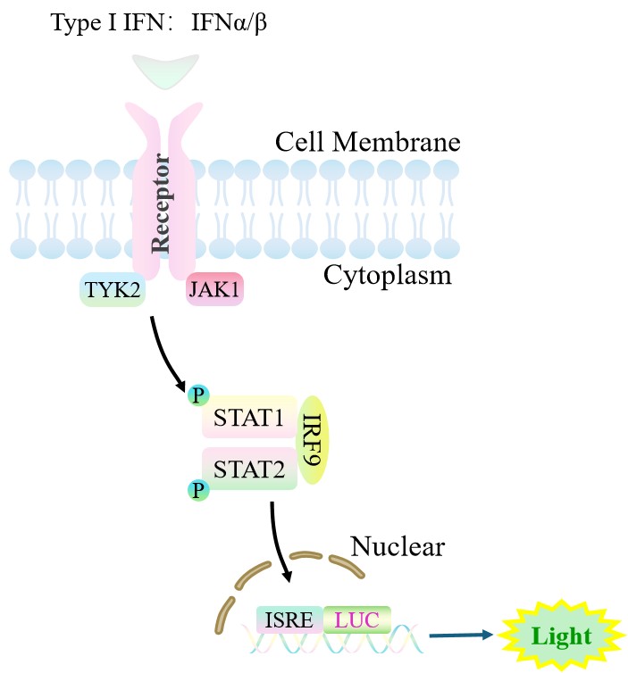 ISRE-Luc THP-1 報告基因細(xì)胞是由 ISRE 調(diào)控并表達(dá) Luc 熒光素酶報 告基因的 THP-1 細(xì)胞。IFN 與受體結(jié)合,激活 ISRE 的原理見下圖所示。