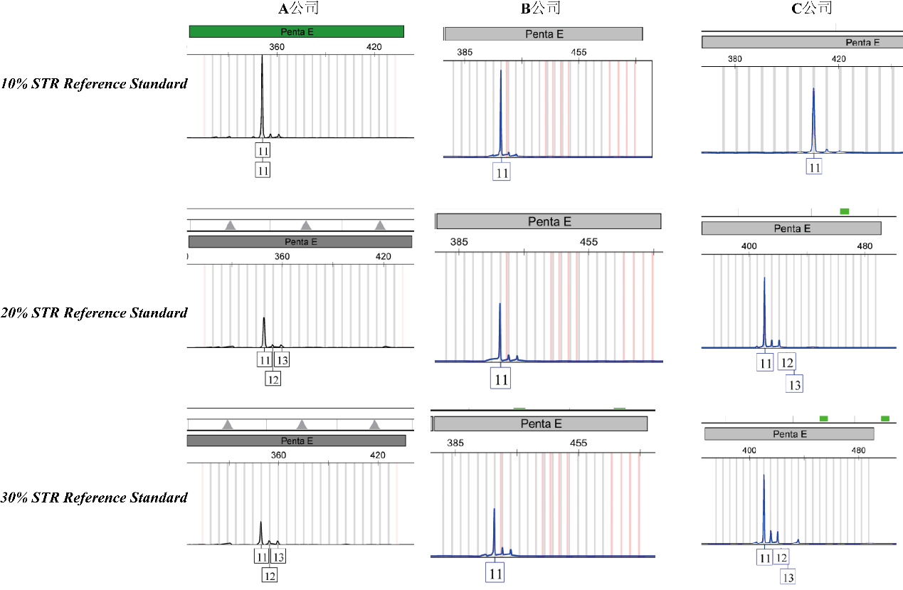 Fig 2. 不同污染占比濃度的STR樣本在三家公司Penta E基因座的STR檢測結果圖,其他20個基因座有類似的情況,文中不一一羅列。