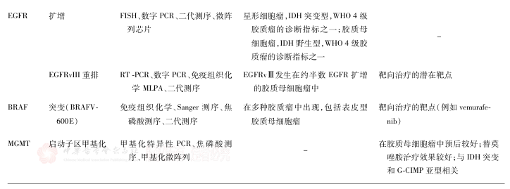 腦膠質(zhì)瘤確診需通過腫瘤切除術(shù)或活組織檢查術(shù)獲取標(biāo)本,進(jìn)行組織病理學(xué)和分子病理學(xué)整合診斷,以確定病理分級(jí)和分子亞型。分子標(biāo)志物對(duì)腦膠質(zhì)瘤的個(gè)體化治療及臨床預(yù)后判斷具有重要意義。