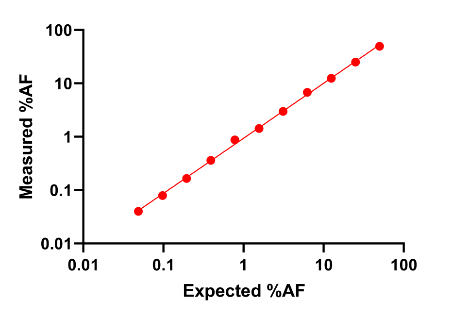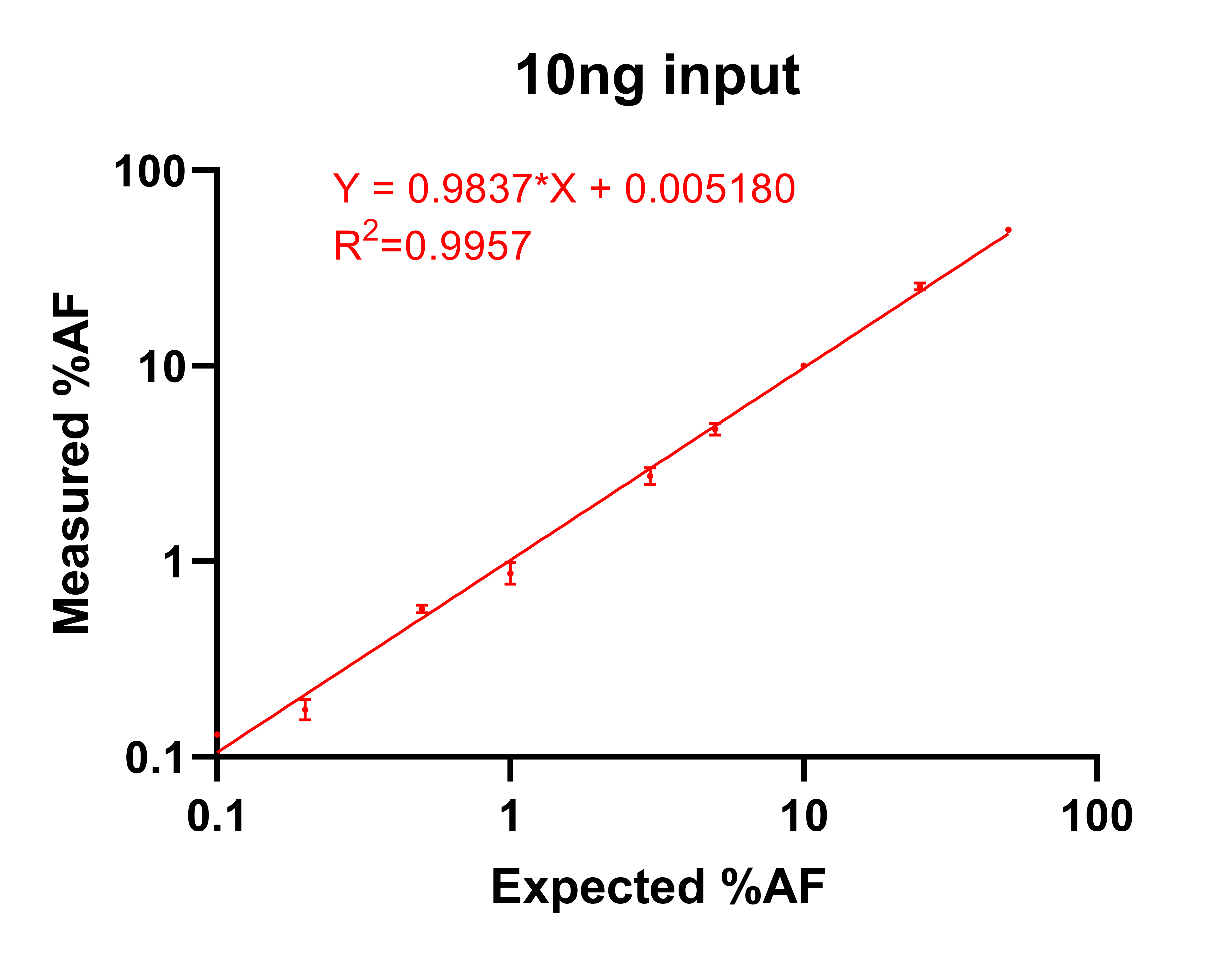 根據(jù)以上結(jié)論,我們選取10ng作為進(jìn)一步的%AF線性范圍探索,首先使用EGFR T790M的對(duì)應(yīng)的陰性標(biāo)準(zhǔn)品,對(duì)50%的標(biāo)準(zhǔn)品進(jìn)行有限稀釋,0.1%-50%間設(shè)置9個(gè)AF梯度,進(jìn)行數(shù)字PCR檢測(cè)(2復(fù)孔)。
