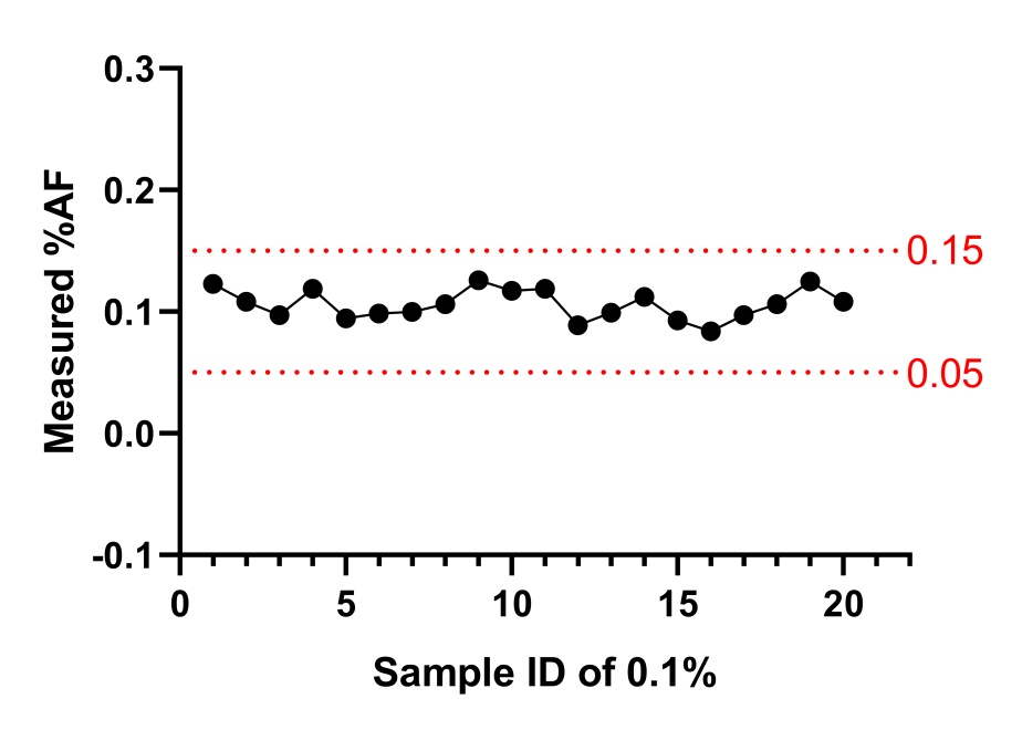 對(duì)20個(gè)0.1%的樣本進(jìn)行數(shù)字PCR檢測(cè),觀察在0.05-0.15%以內(nèi)是否達(dá)成95%檢出。