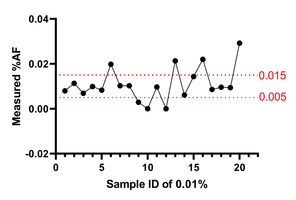 對(duì)20個(gè)0.01%的樣本進(jìn)行數(shù)字PCR檢測(cè),觀察在0.005-0.015%以內(nèi)是否達(dá)成95%檢出。