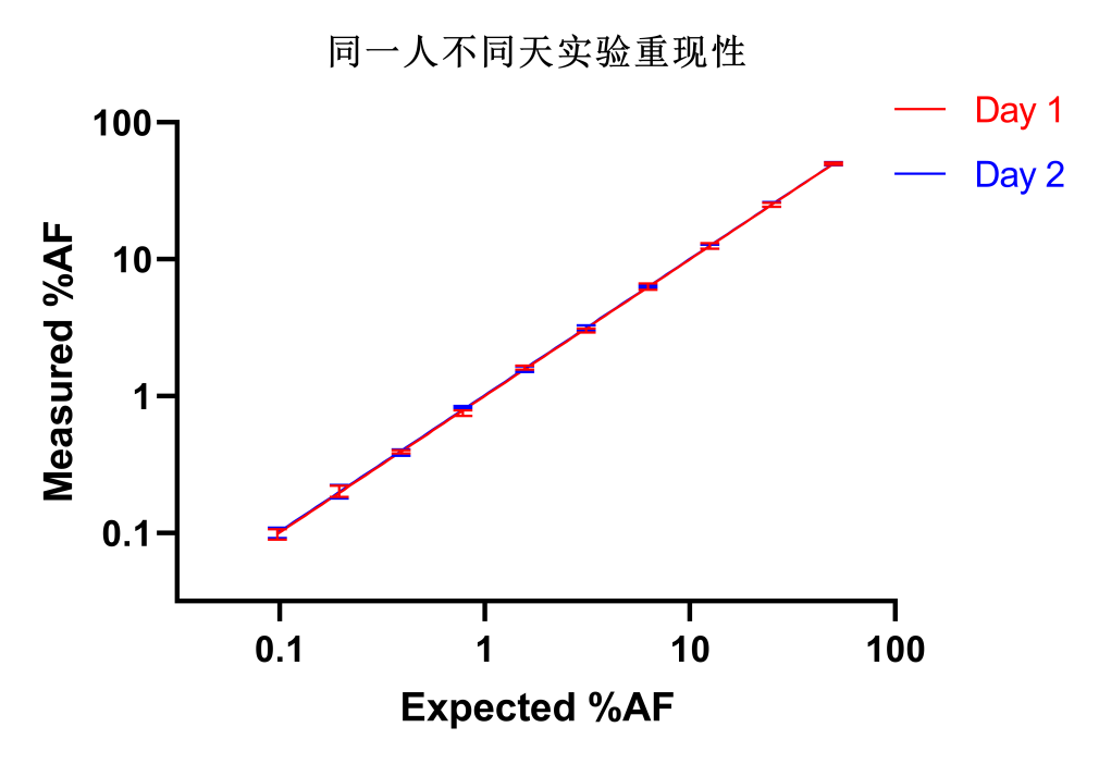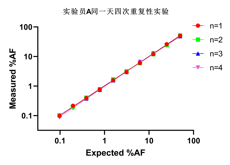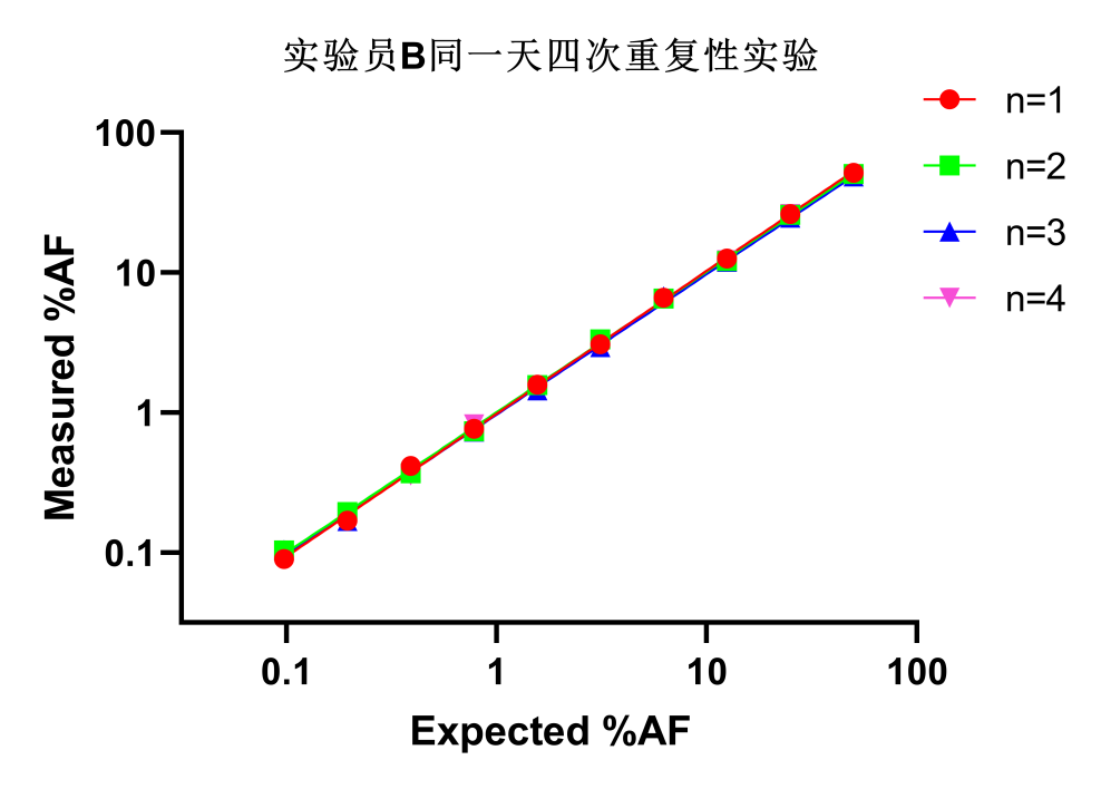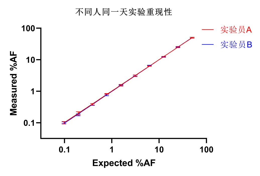 取10個(gè)不同AF(1%~50%)的標(biāo)準(zhǔn)品樣本,分別安排實(shí)驗(yàn)員A、實(shí)驗(yàn)員B在同一天,每人進(jìn)行四次檢測(cè)。