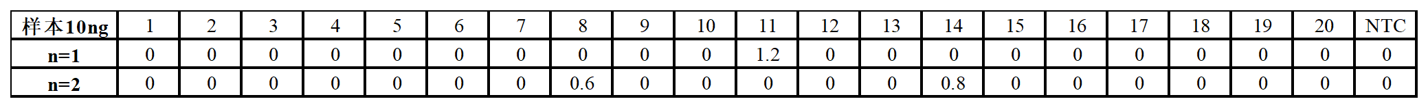 待測(cè)樣本:10個(gè)NGS驗(yàn)證為陽性的樣本(編號(hào)1-10); 10個(gè)NGS驗(yàn)證為陰性的樣本(編號(hào)11-20)。對(duì)20個(gè)樣本分別使用數(shù)字PCR檢測(cè)。