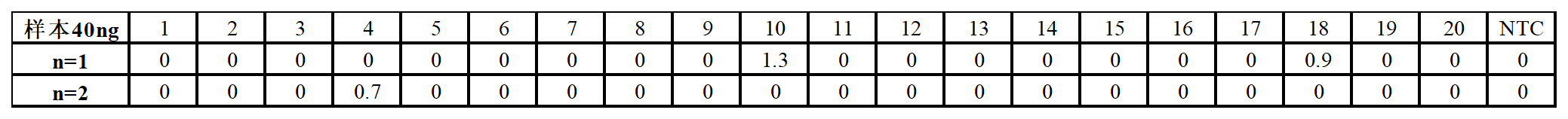 待測(cè)樣本:20個(gè)陰性樣本和1個(gè)NTC。分別將投入量設(shè)置為10ng和40ng,每個(gè)樣本做兩個(gè)重復(fù)進(jìn)行Bio-Rad數(shù)字PCR檢測(cè)。