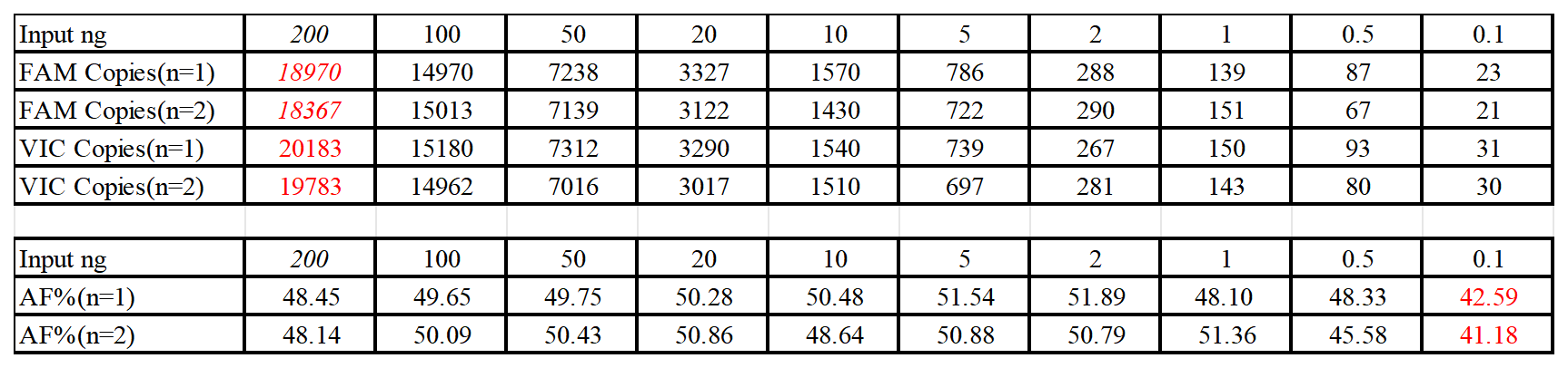 1.2 投入量在0.1ng~200ng間設(shè)置10個(gè)梯度,進(jìn)行數(shù)字PCR檢測(cè)(2復(fù)孔),判斷是否滿足%AF=50±10%波動(dòng)。